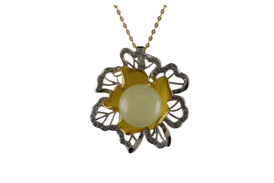 材质:吊坠托为925银;牡丹花为天然的白冰玉料。