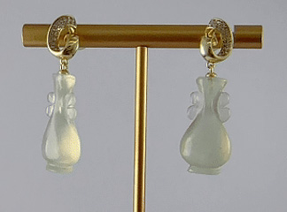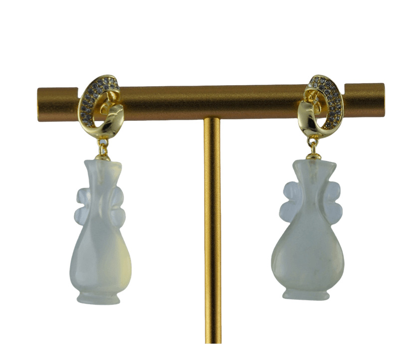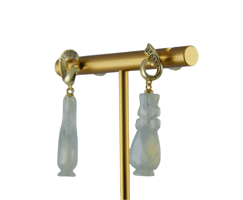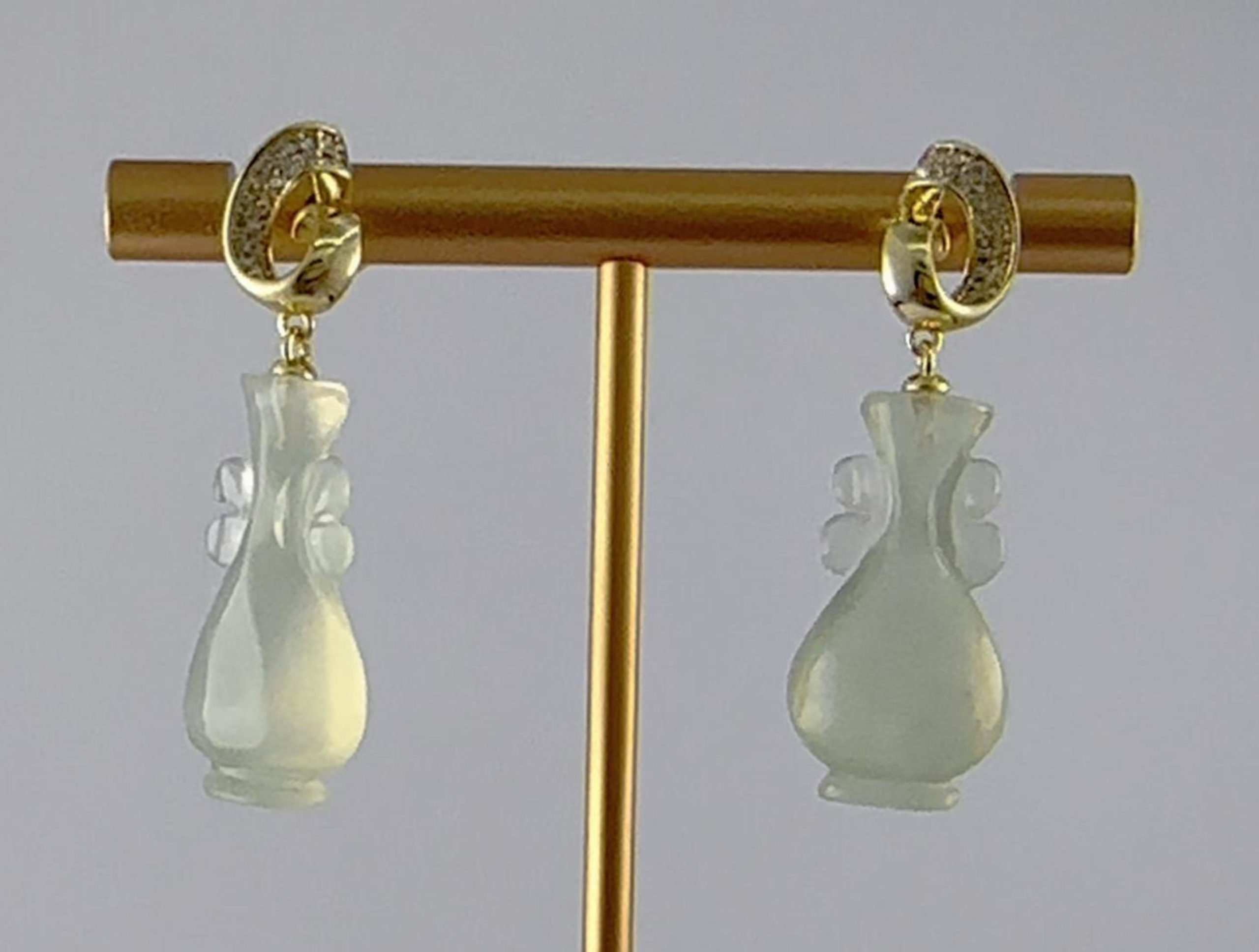 耳钉主体以925银手工打磨成飘带扣形状,表面经抛光呈现柔和的金属光泽。飘带内侧采用隐蔽式密镶满小水钻锆石。从正面视角看,只见飘带的流畅线条;当佩戴者侧头时,内侧的钻光若隐若现,璀璨夺目,形成“犹抱琵琶半遮面”的含蓄美感。下方是纯手工立体雕刻成如意瓶造型。线条柔美,层次分明。匠人通过深浅不一的刀法,赋予玉石灵动的生命力,每个都独一无二,不可复制。