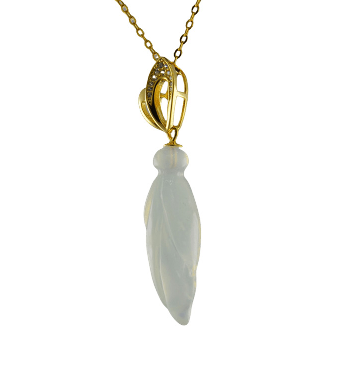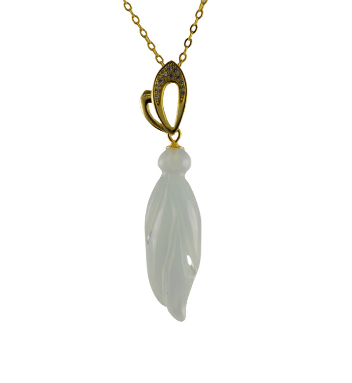 2. 金色丝带形吊环上连接大玉兰花,吊环采用古法雕刻手法,给人轻奢清爽的感觉。