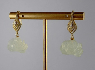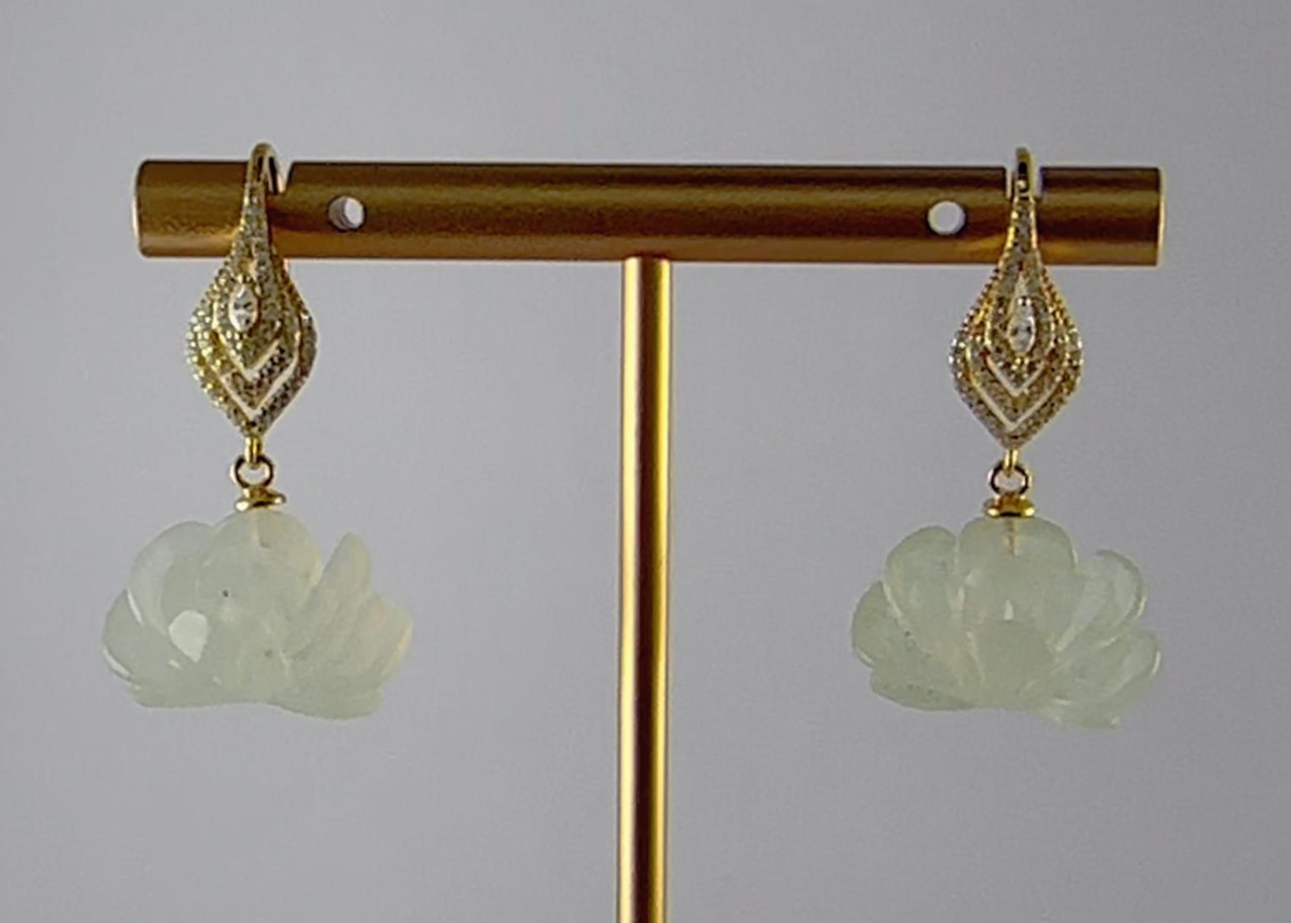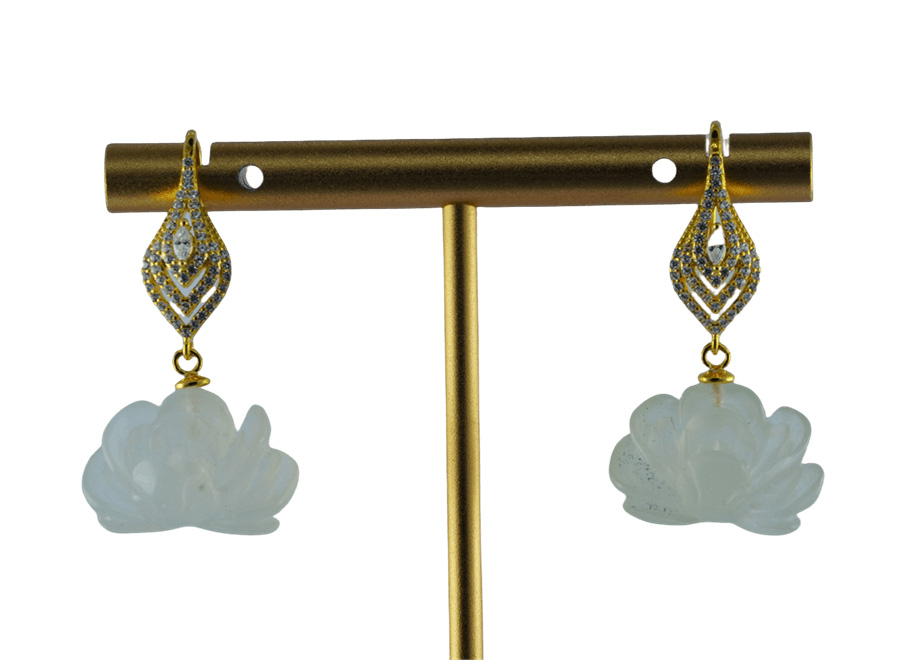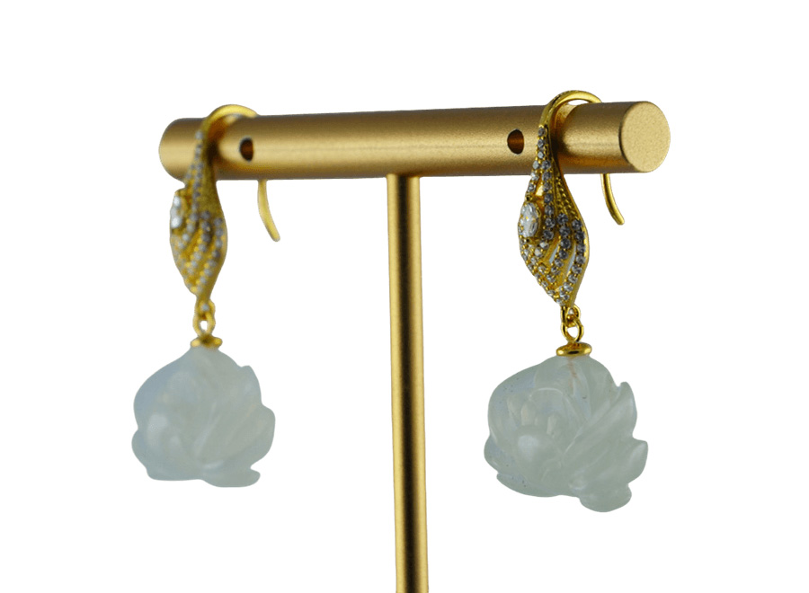 这款耳钩以925银条抽象的勾勒出天鹅的轮廓——修长的颈项为钩。以三个大小不同的菱形,分三层拼成抽象的天鹅身体,上面密镶璀璨小水钻锆石。天鹅之下,连接由天然玉石手工雕刻而成的盛放牡丹。匠人以刀代笔,将玉石的温润化作层层叠叠的花瓣,牡丹花型丰盈,脉络清晰。玉石天然的色泽与纹理,让每一朵牡丹都独一无二。佩戴于耳畔,仿佛将一份“忠贞相伴、富贵长久”的美好祝愿,轻轻诉说。