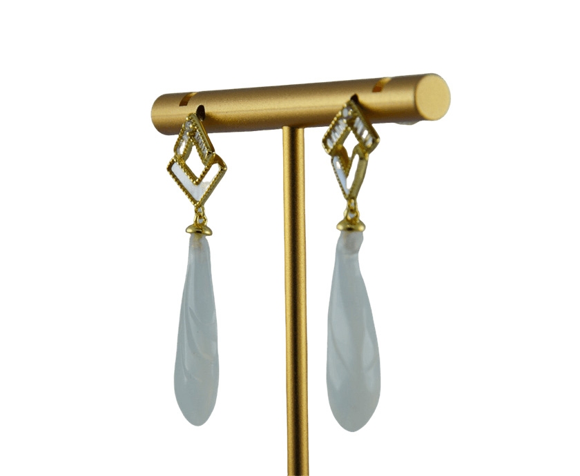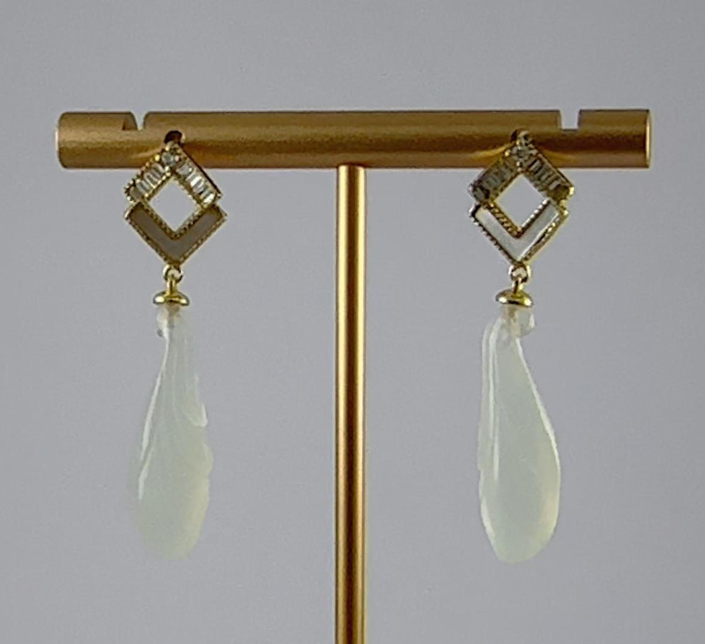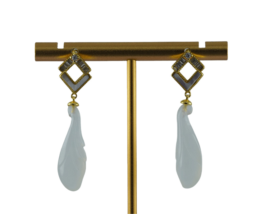 独创的双L造型宛如一对优雅的羽翼,又似相互依偎的剪影。上翼密镶水钻,捕捉并散射每一缕光线,闪耀如晴空下的冰晶;下翼镶嵌天然贝壳,其独特的虹彩光泽随角度流转,温润如月华浸润的珍珠。双翼之下,悬坠着一颗精心雕琢的天然玉石玉兰花。玉石不语,却自有千言:澄澈如冰,每颗玉都承载着独一无二的自然印记。
