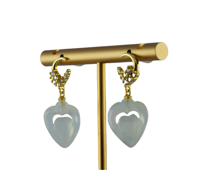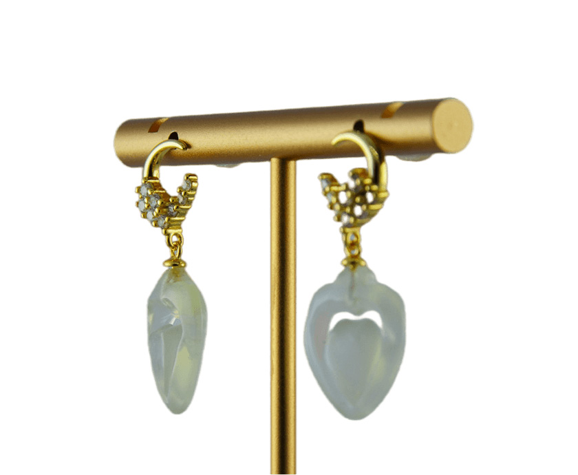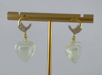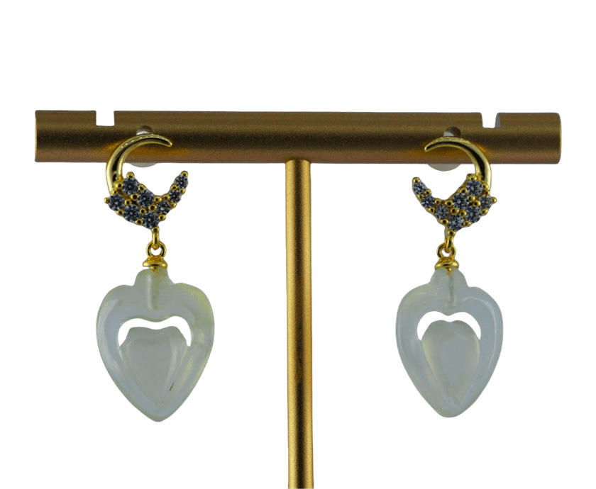 耳坠以柔美的月牙造型呈现,由纯净的925银精心打造,宛若一弯新月悄然栖宿。在月牙的底端,匠心独运地点缀着晶莹闪烁的细小水钻锆石,如不经意间洒落的星辰。在硬朗的C形末端,悬念般坠下一枚天然玉石雕琢的桃心。玉石保留了天然的肌理与韵味,手工雕刻的痕迹清晰可见,桃心形朴拙而生动。让耳边的这弯银月与星光,陪伴你在现代都市中,珍藏一份内心的如意与安宁,时刻提醒你:美好与祝福,始终悬垂在心间。
