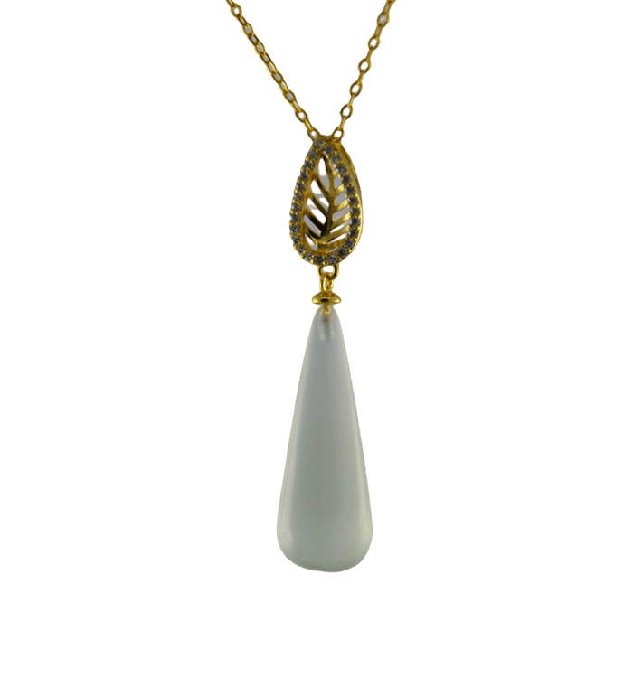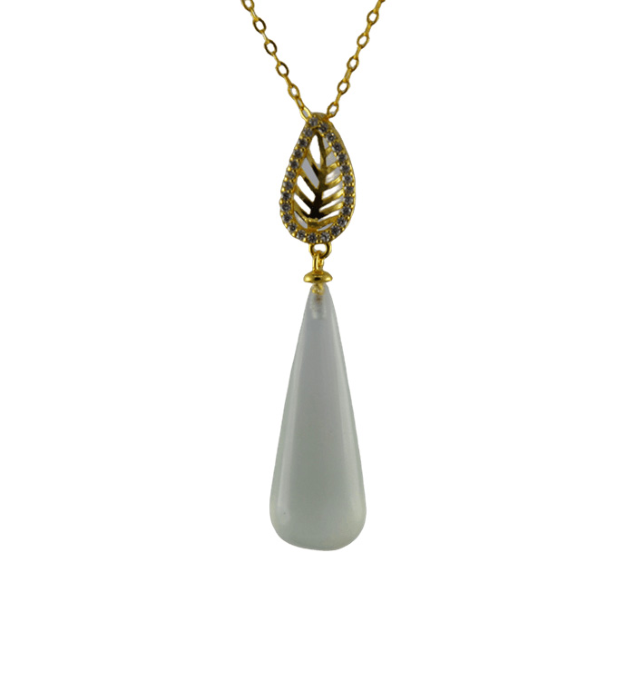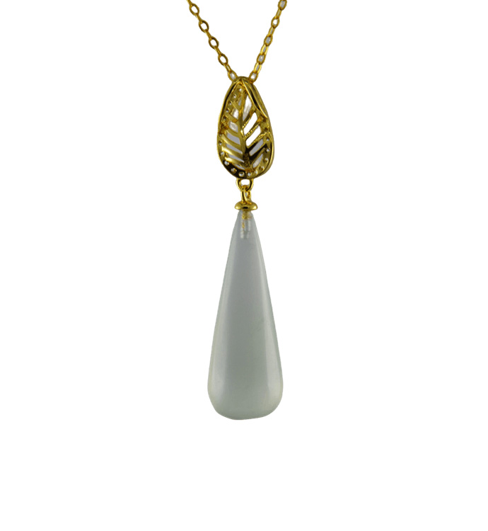 2. 金色树叶形吊环上连接锥形水滴,吊环采用古法雕刻手法,给人形象清爽的感觉。