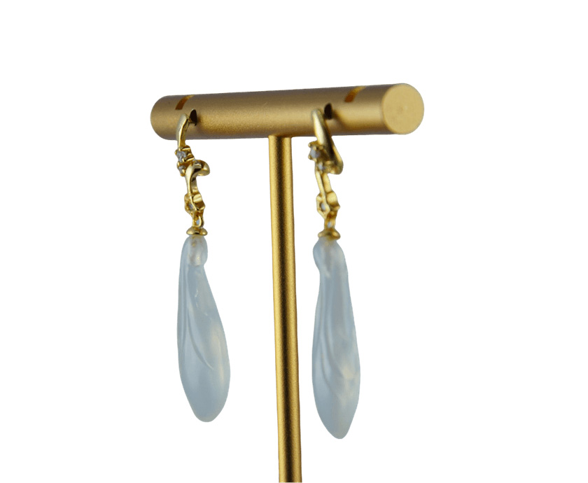 设计灵感源自雨后林间的刹那。两节925银锻造的树枝,形态简练而充满力量感,仿佛是树木在生长过程中留下的印记。树枝的节点处,水钻以露珠的姿态悄然停驻。它们并非满铺的奢华,而是点到为止的提亮。枝下悬坠的天然玉兰花,是整件作品的静谧之心。玉石独有的温润质地,将花的灵动凝固为永恒的形态。手工雕刻的痕迹被完整保留,每一道弧线都顺应玉料的天性,不刻意、不矫饰。玉兰花仿佛随时会坠落,却永恒悬停,将“将落未落”的瞬间凝固成一首无声的俳句。
