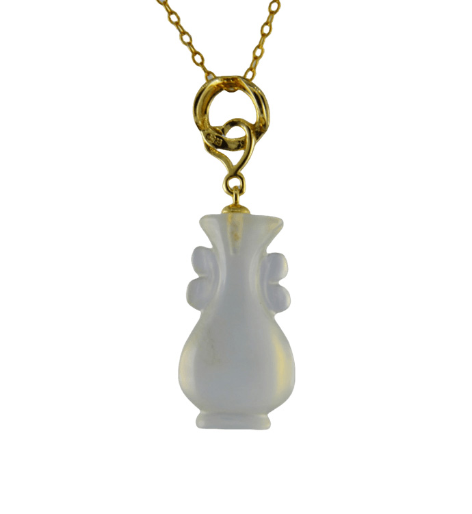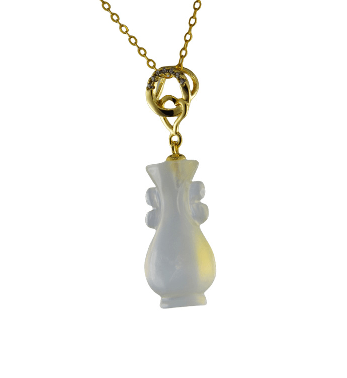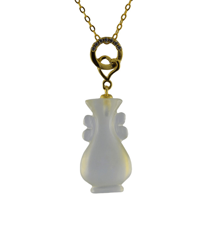 2. 金色桃心加环形吊环上连接如意瓶,吊环采用古法雕刻手法,给人简约清爽的感觉。