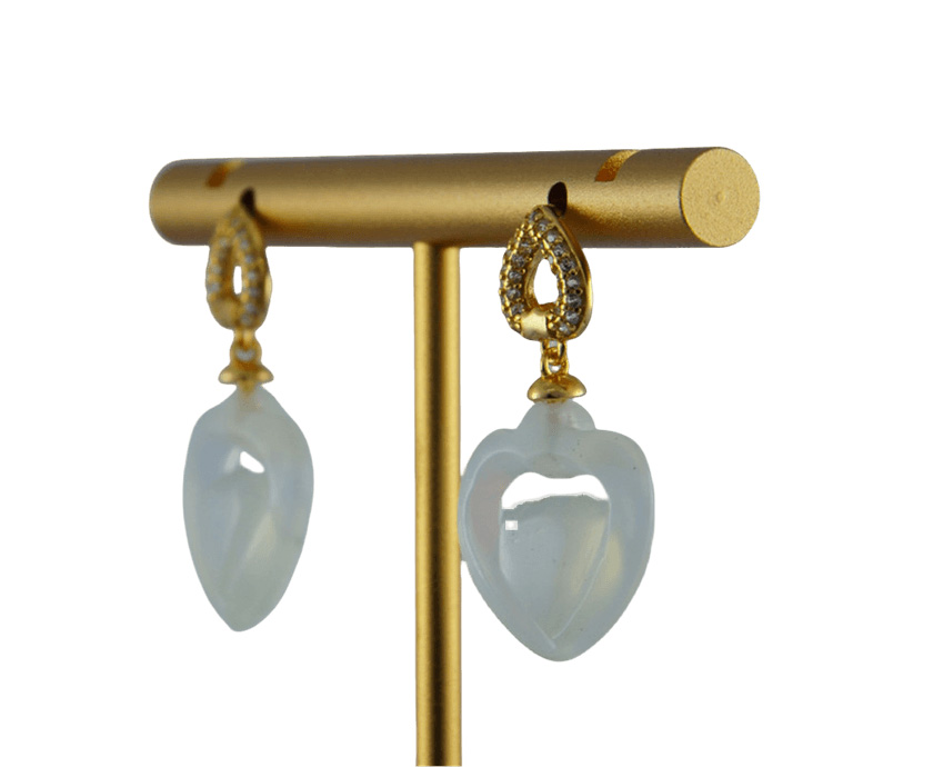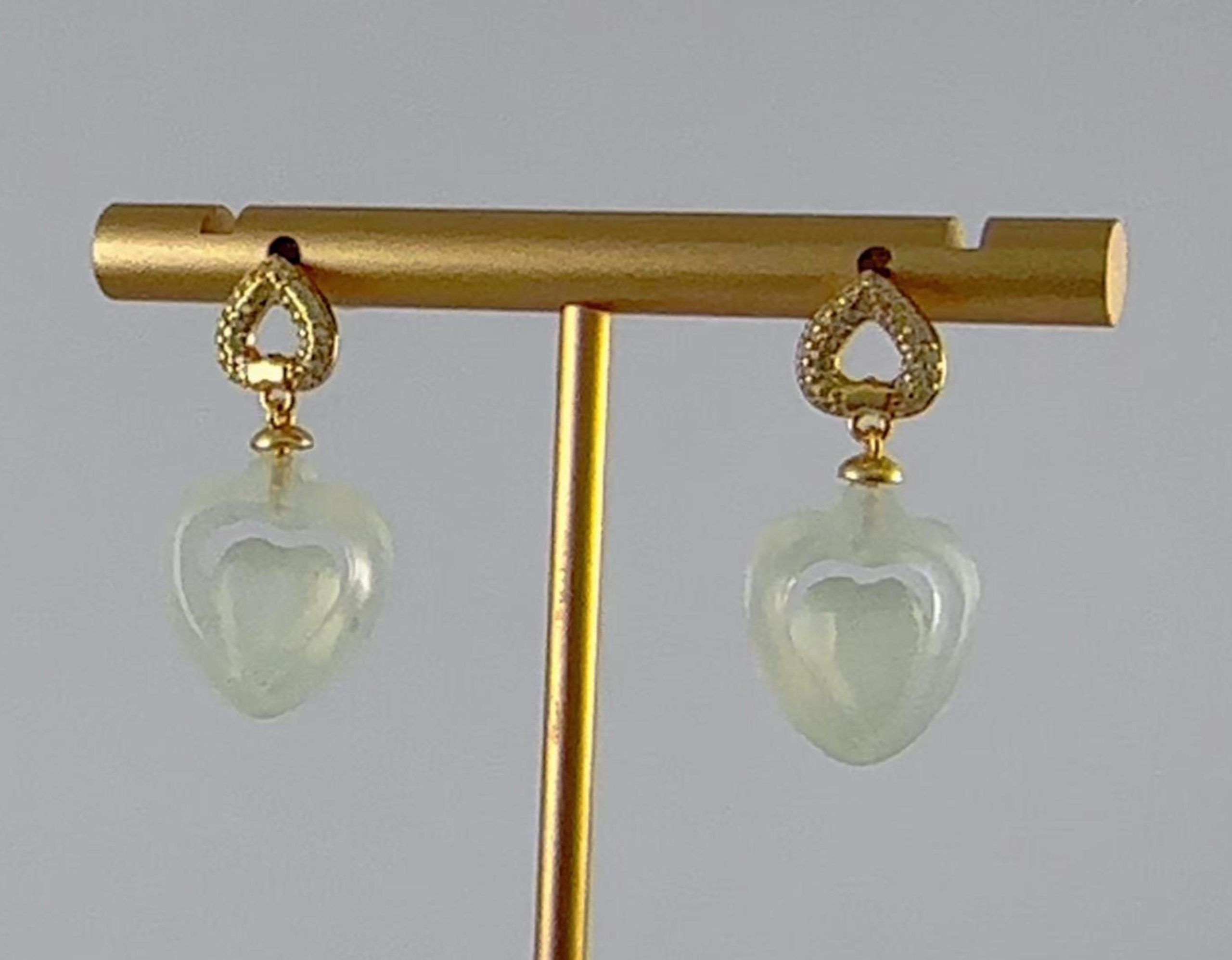 耳钉主体以925为基底,弯绕成一道简约而富有现代感的桃心圈。圈之上精心密镶璀璨夺目的细小水钻锆石。下面悬垂的那枚天然玉石手工雕刻的桃心。玉石汲取自然精华,质地温润,色泽柔和,触感生温。两颗桃心,一上一下,一璀璨一温润,一现代一古典,形成巧妙的呼应。玉心寓意着“一片冰心在玉壶”的纯洁真情,更代表着“心心相印,永结同心”的美好祝福。