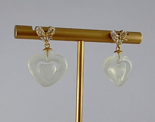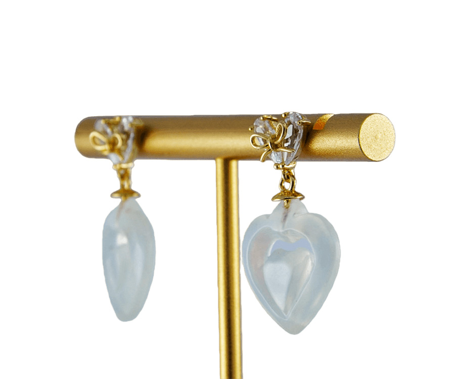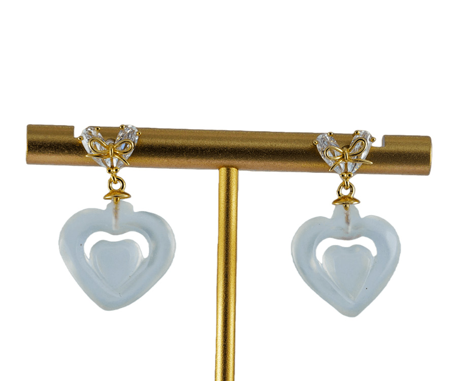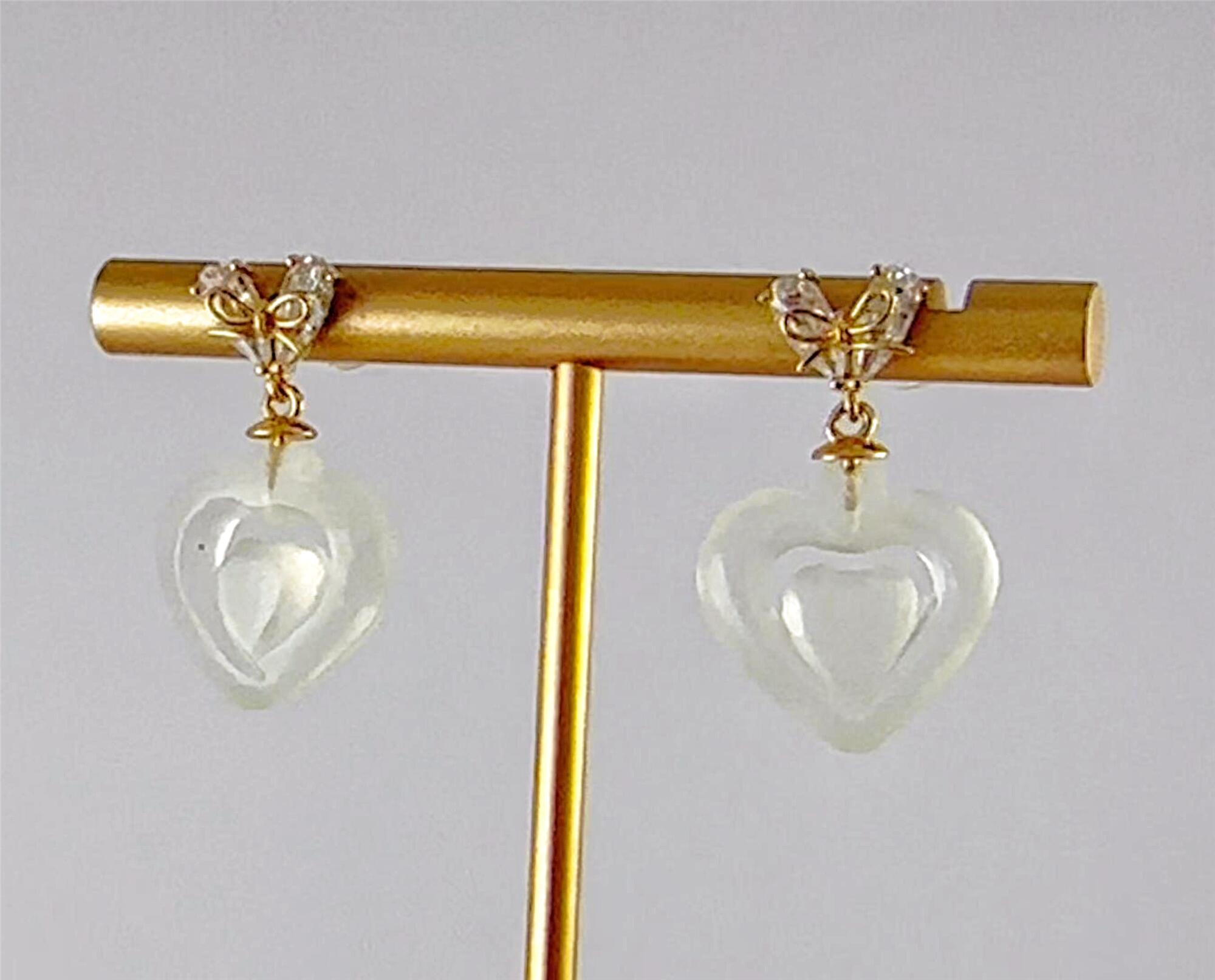 耳钉是一颗夺目的桃心形切割大水钻锆石。它采用高品质锆石,火彩绚烂,在耳畔绽放无与伦比的耀目光芒。在主钻桃心的上面,匠人以古老的金工技艺,手工篆雕刻出一个蝴蝶结。主钻之下悬垂的那枚天然玉石手工雕刻的桃心。玉石汲取自然精华,质地温润,色泽柔和,触感生温。两颗桃心,一上一下,一璀璨一温润,一现代一古典,形成巧妙的呼应。玉心寓意着“一片冰心在玉壶”的纯洁真情,更代表着“心心相印,永结同心”的美好祝福。