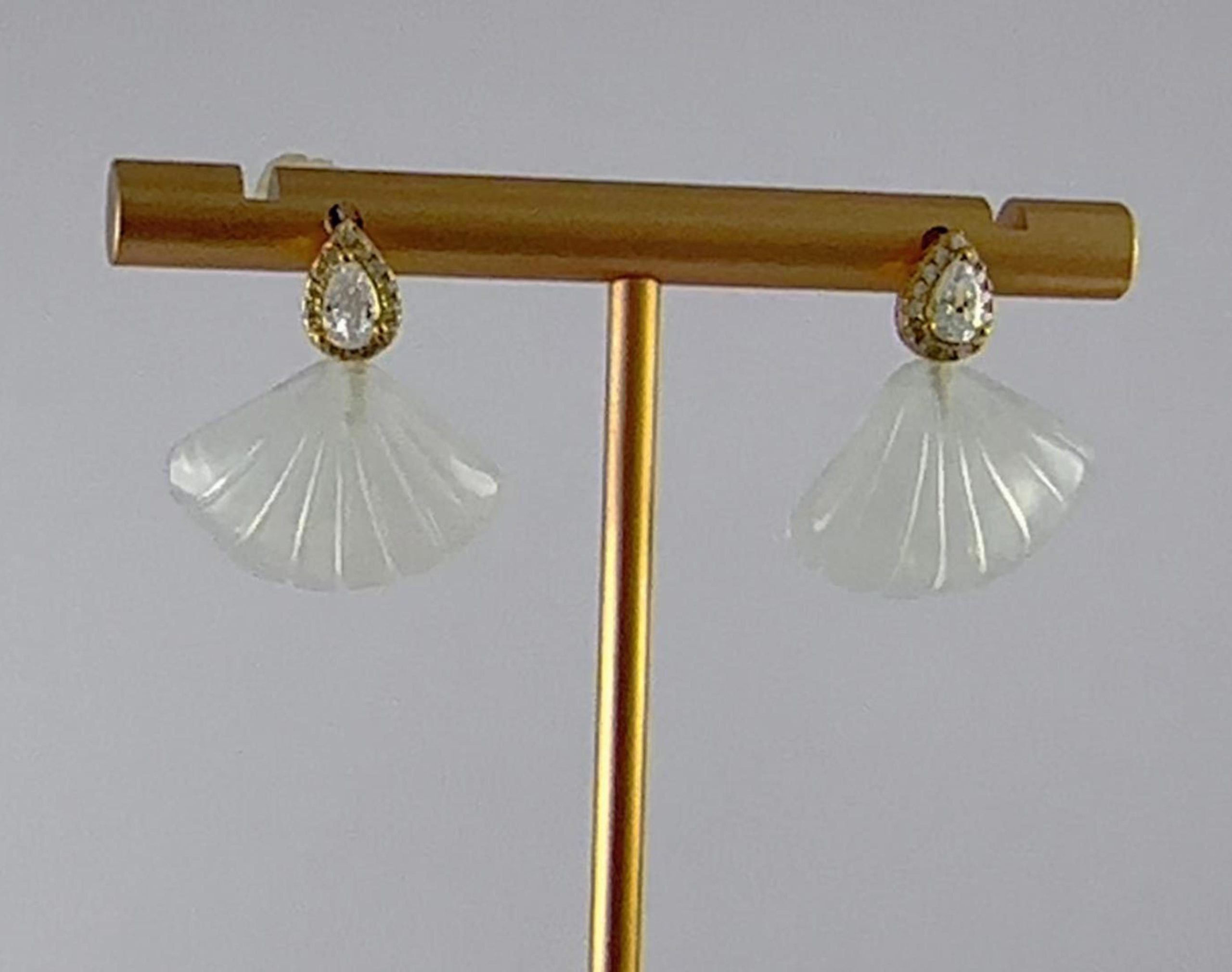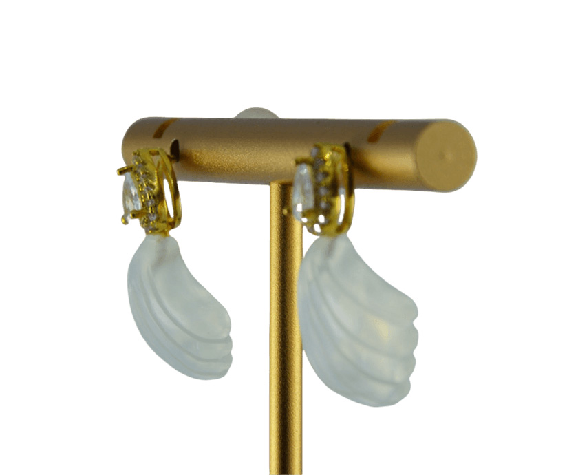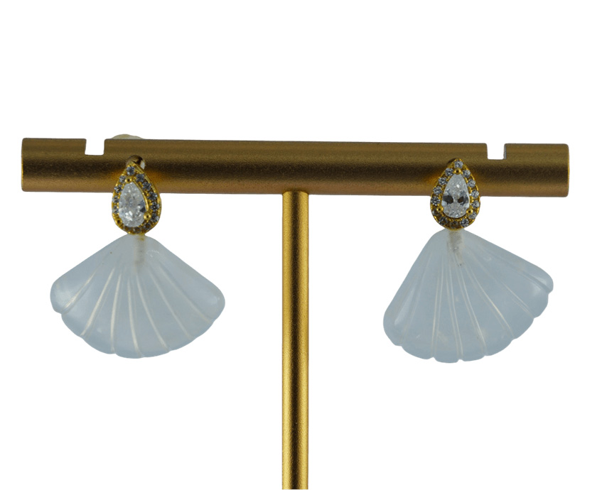 耳钉是一颗璀璨夺目的水滴形切割主水钻锆石,在它的四周,以精工密镶一圈细密小水钻锆石。大小水钻交相辉映,主次分明,在方寸之间构筑出既有建筑结构感又不失璀璨华丽的视觉焦点。水钻下是一枚天然玉石手工雕刻而成的贝壳。玉石温润的质感,是任何人工材料都无法复制的生机。匠人依据玉料的原生形态与色泽,磨砺出饱满、线条流畅得仿佛下一秒就要滑落。