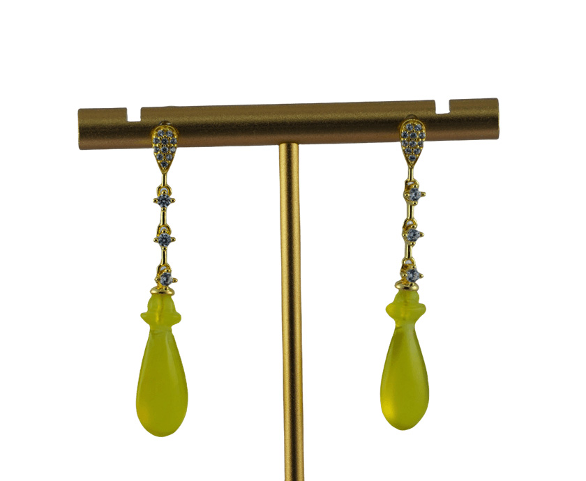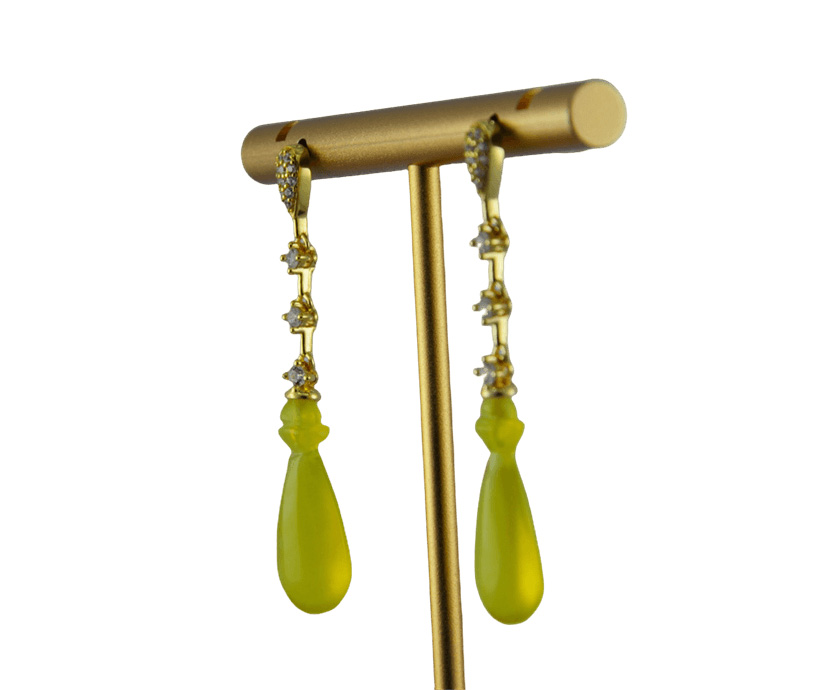 这款水滴形耳钉满镶小水钻在925银托之上。下方两粒水钻与其遥相呼应。其间以纤巧的银环灵动相连,形成一条会随着步伐轻轻摇曳的“光之链条”。所有光华最终温柔地导向终点——一枚由天然玉石手工雕刻而成的平安瓶。匠人顺应玉石的天然肌理与色泽,将瓶形打磨得圆润饱满,触手生温。玉质的柔光与钻石的锐彩在此交融,坚硬的矿石被赋予了最柔软的形态,恰似一份由光芒护送、最终归于温润的深情告白。