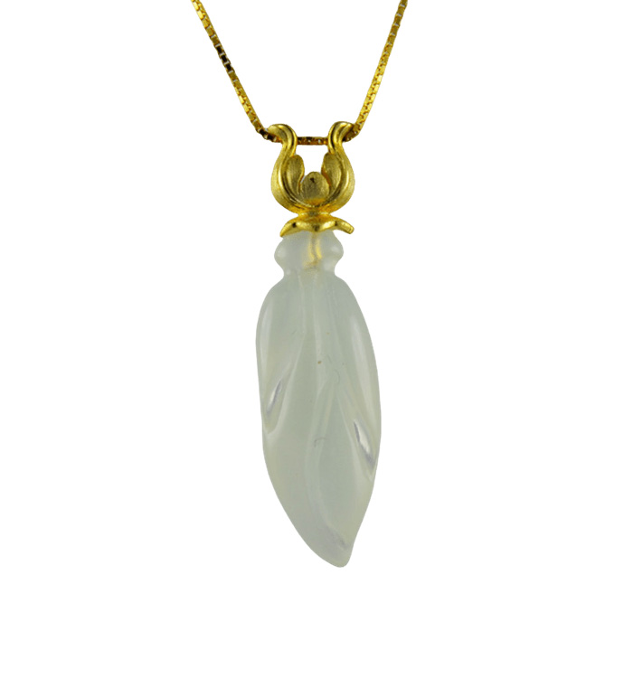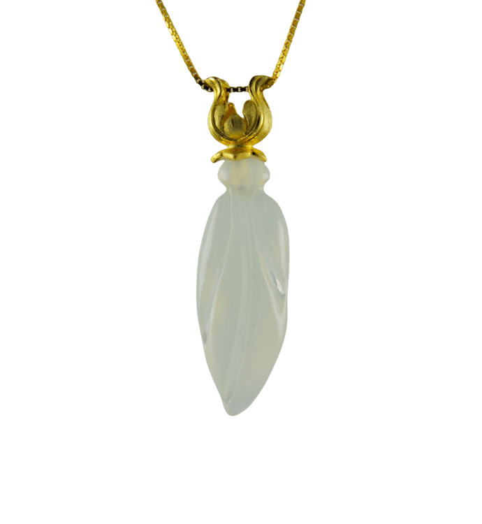 2. 金色玫瑰花形吊环上连接大玉兰花,吊环采用古法雕刻手法,给人古朴清爽的感觉。