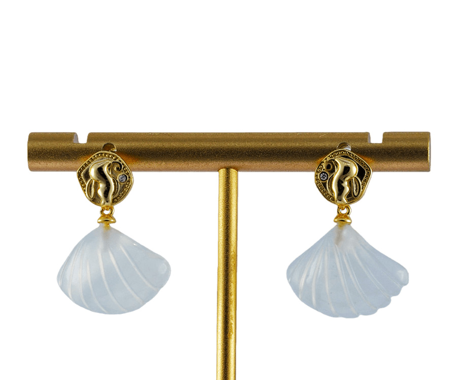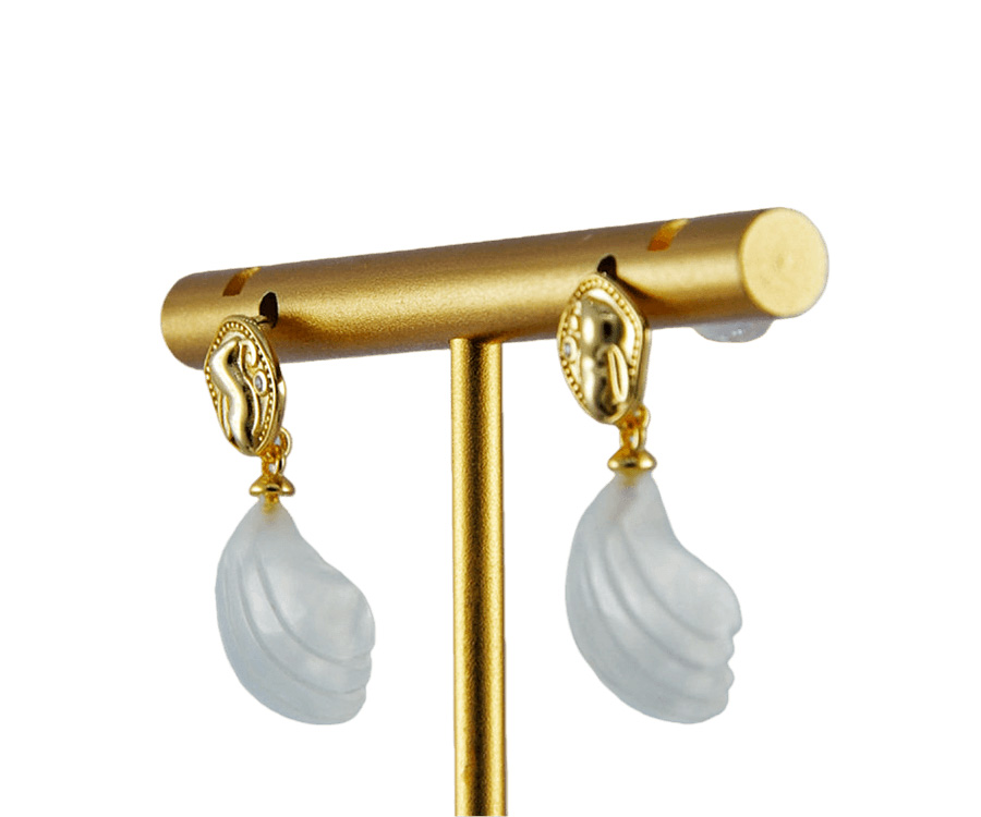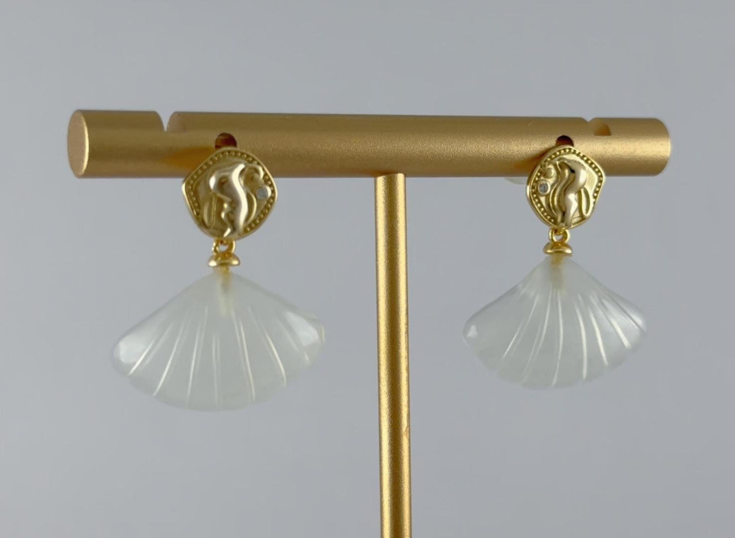 耳钉采用925银丝,经由匠人手工纂刻,打造出立体的精灵造型。她仿佛刚从晨露中苏醒,灵动的身姿与微绽的羽翼在光影下栩栩如生,每一道纹路都倾注了手工雕琢的温度与灵魂。下方悬坠的,是一枚经由手工精磨的天然玉石。匠人依照原石的自然纹理,将其细细打磨成饱满的贝壳形态,保留了玉石最温润原始的触感。玉石与银饰的相遇,是金属光泽与自然矿物的和谐共鸣。