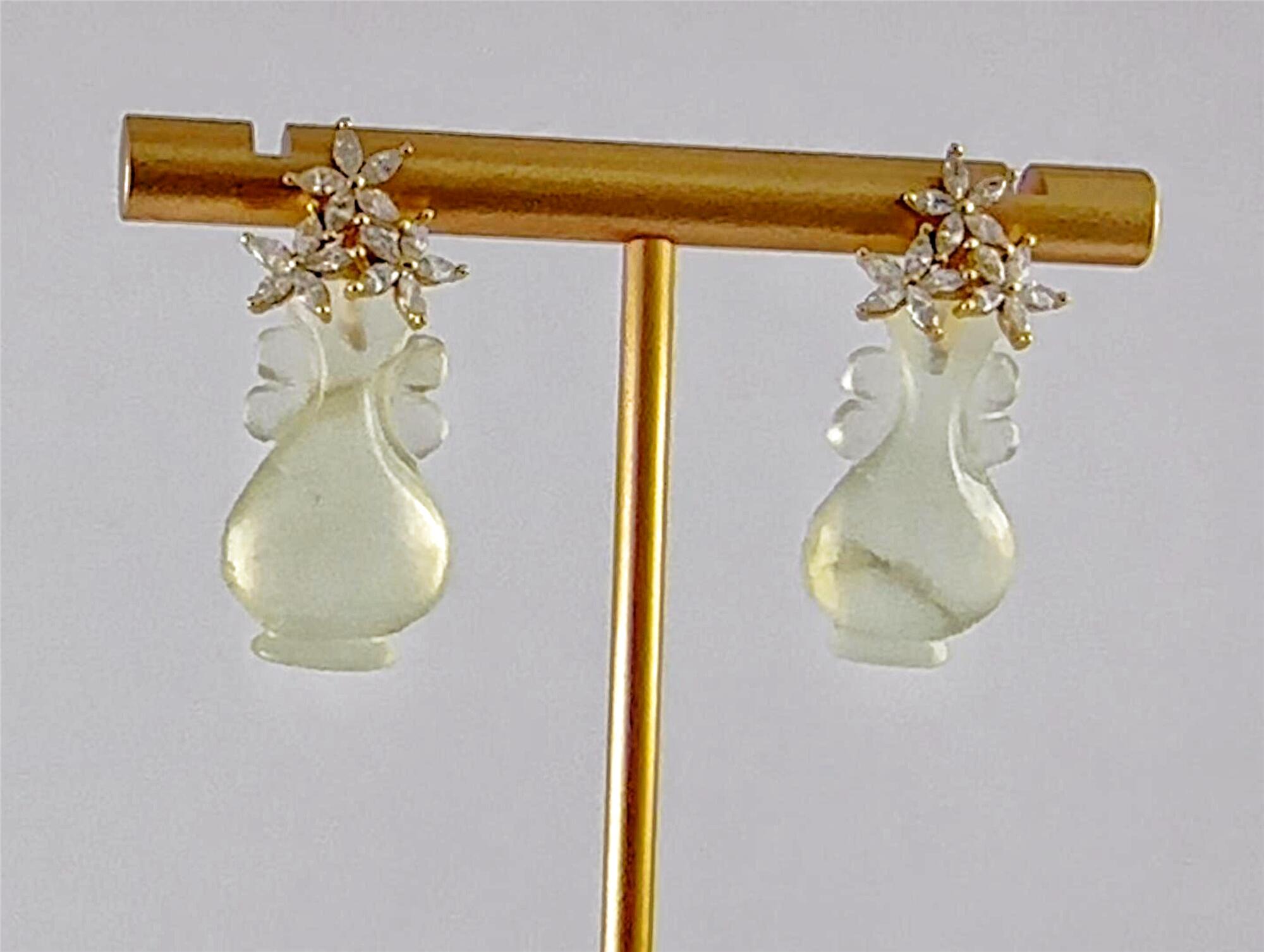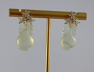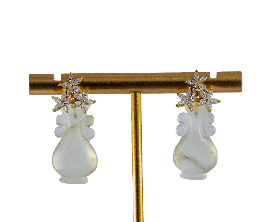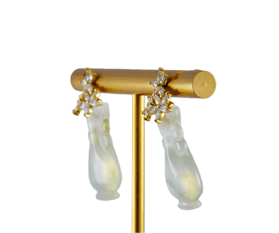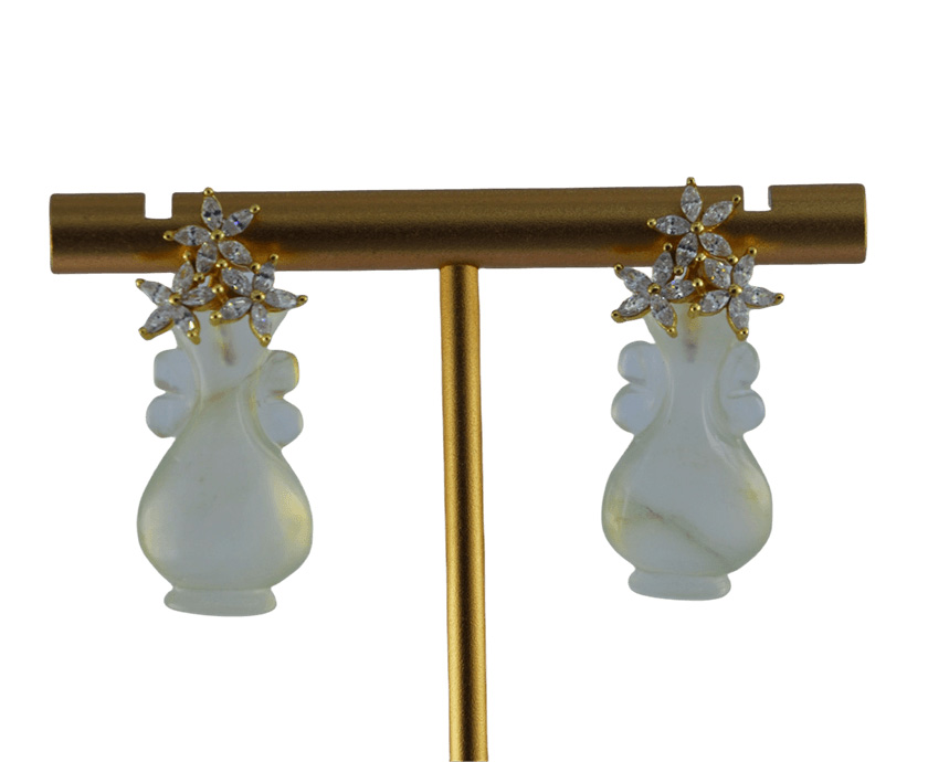 耳钉以925银为基底,三枝五瓣花朵璀璨的水钻锆石镶嵌堆砌成花冠形,下方是纯手工立体雕刻成如意瓶造型。线条柔美,层次分明。匠人通过深浅不一的刀法,赋予玉石灵动的生命力,每个都独一无二,不可复制。作品将古典花冠的华美与如意瓶的清雅巧妙融合,通过满钻镶嵌的闪耀与天然玉石的内敛形成质感碰撞,既有轻奢品的精致感,又有日常佩戴的百搭性。