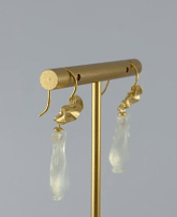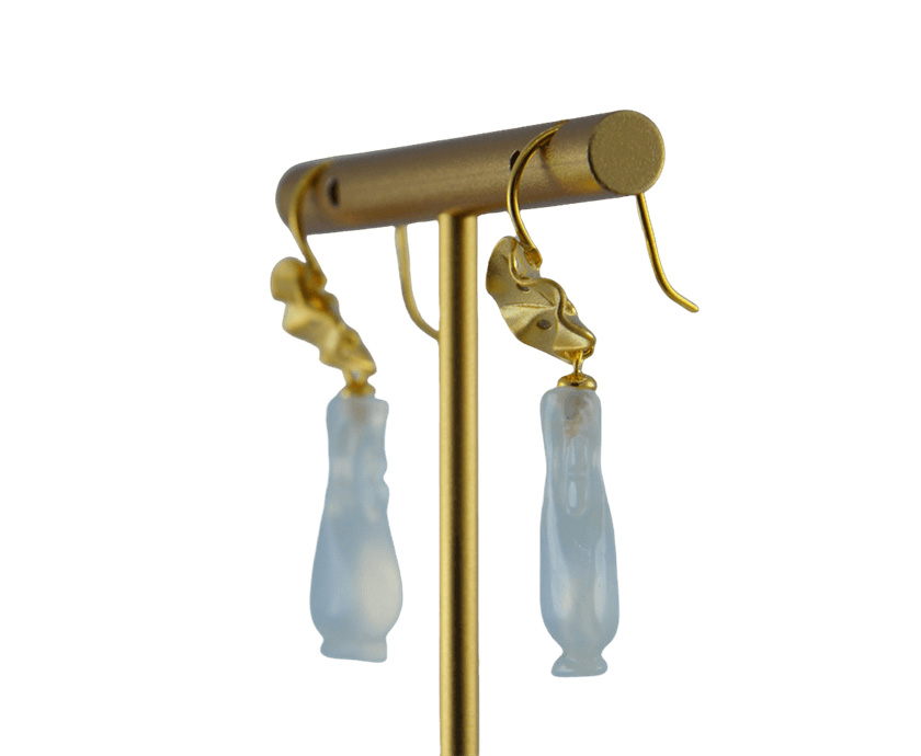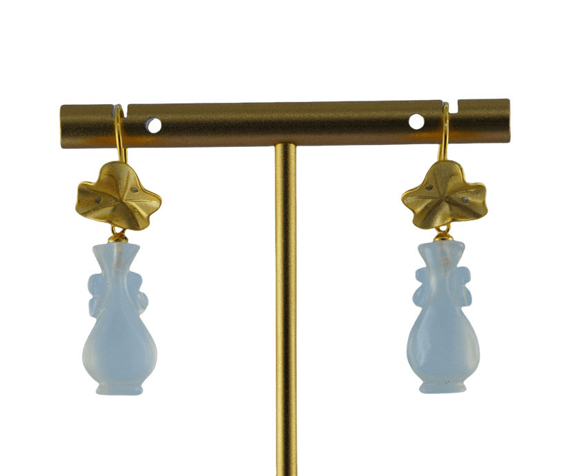 耳钩与一片立体的925银荷叶相连。匠人通过细腻的锻造与錾刻,再现了荷叶自然的卷边与起伏的脉理。它并非完美对称的工笔,而是带着手作的随性之美。荷叶下是一枚天然玉石手工雕刻而成的如意瓶。匠人依据玉料的原生形态与色泽,磨砺出饱满、圆融的如意瓶造型,线条流畅得仿佛下一秒就要滑落。佩戴这对耳环,仿佛将一片静谧荷塘与一滴永恒清露藏于耳畔,在步履匆匆间,提醒自己保持内心的清澈与柔软,于纷繁世界中,守住一方自在的清凉。