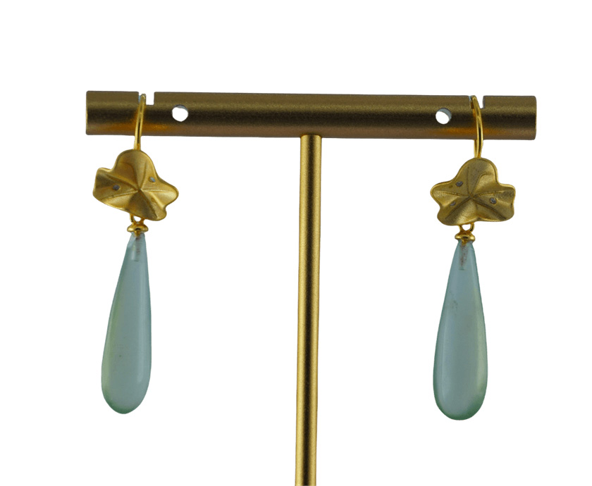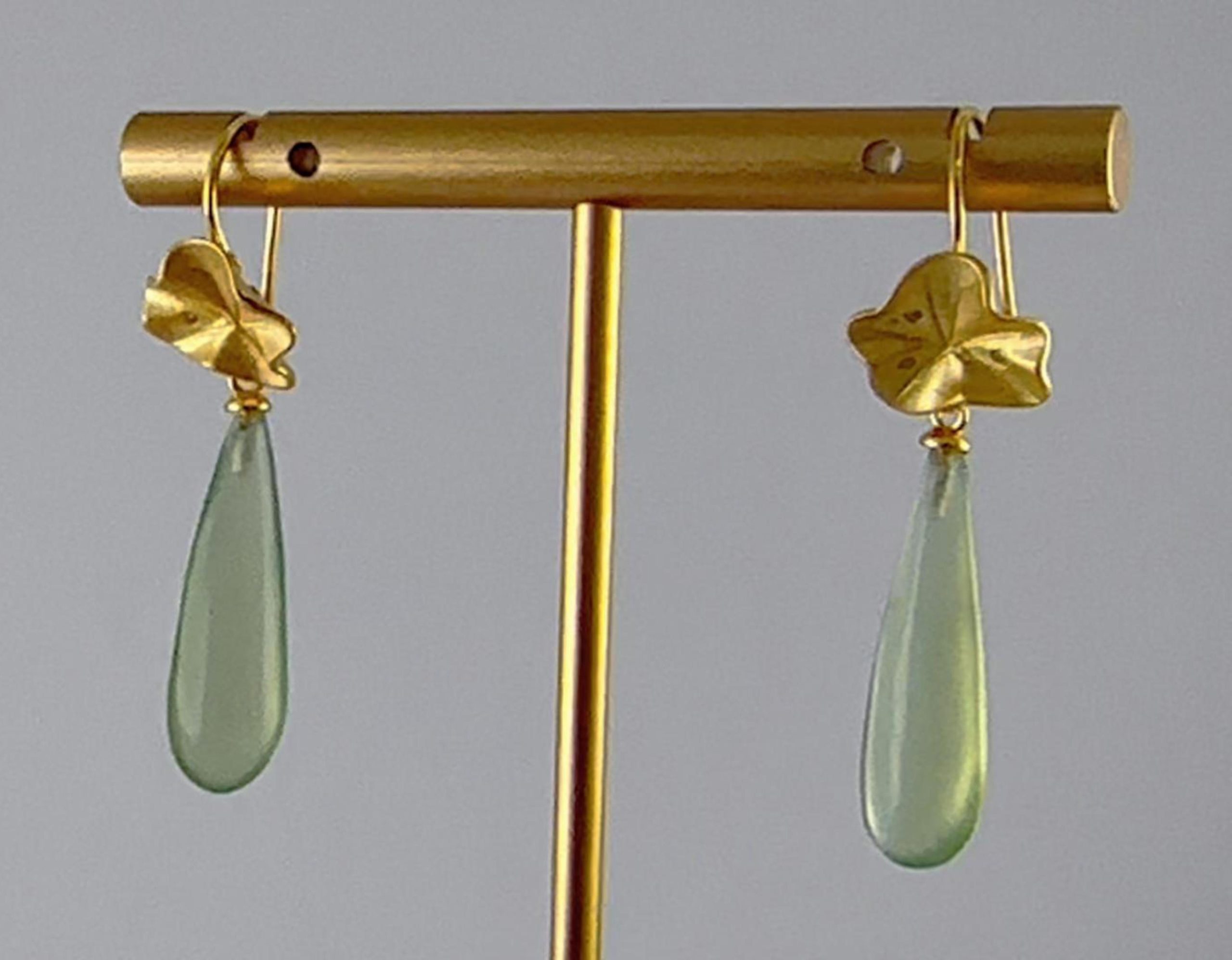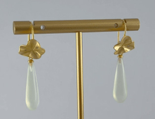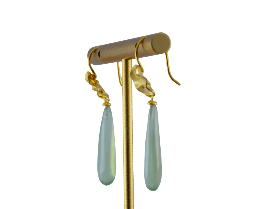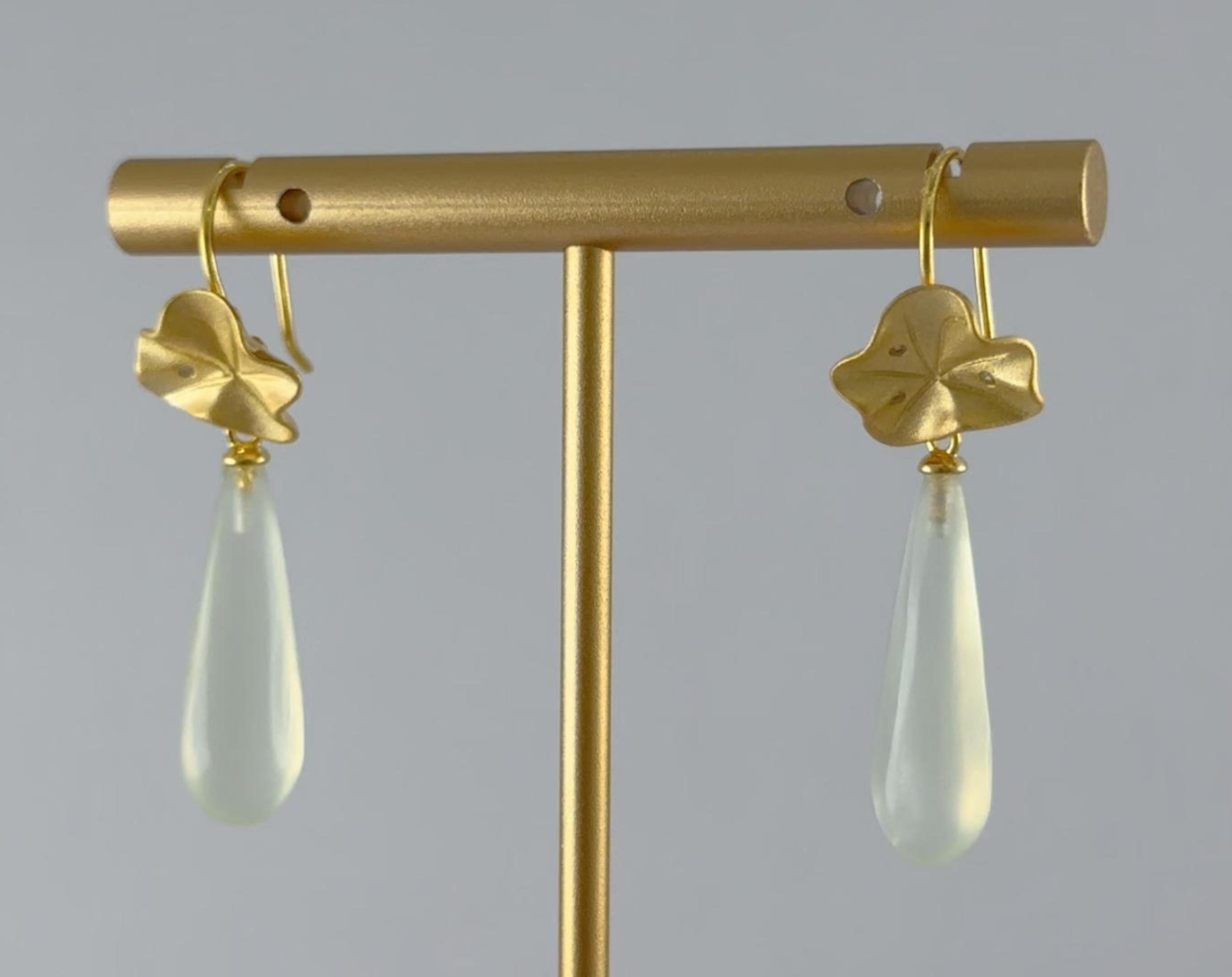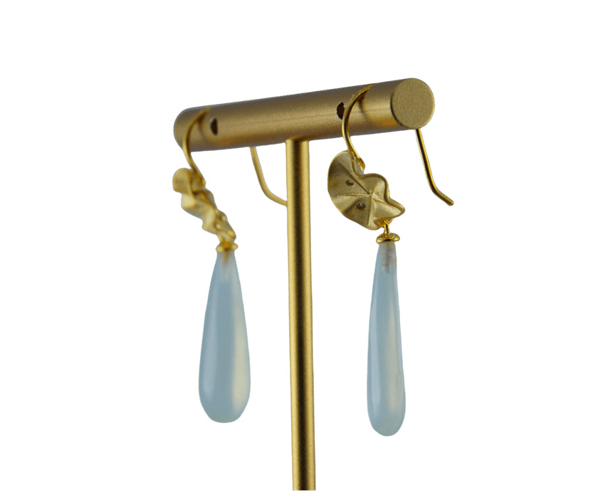 耳钩与一片立体的925银荷叶相连。匠人通过细腻的锻造与錾刻,再现了荷叶自然的卷边与起伏的脉理。它并非完美对称的工笔,而是带着手作的随性之美。荷叶下是一枚天然玉石手工雕刻而成的水滴。匠人依据玉料的原生形态与色泽,磨砺出饱满、圆融的水滴造型,线条流畅得仿佛下一秒就要滑落。佩戴这对耳环,仿佛将一片静谧荷塘与一滴永恒清露藏于耳畔,在步履匆匆间,提醒自己保持内心的清澈与柔软,于纷繁世界中,守住一方自在的清凉。