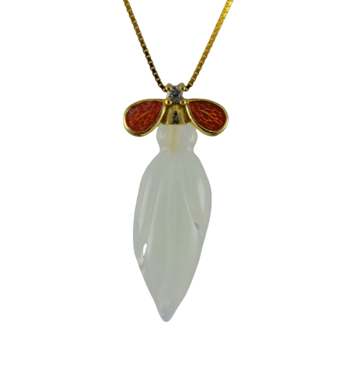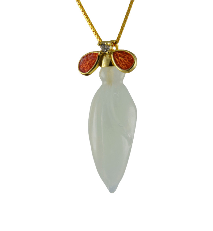 2. 金色蝴蝶形吊环上连接玉兰花,吊环采用古法雕刻手法,给人形象清爽的感觉。