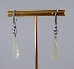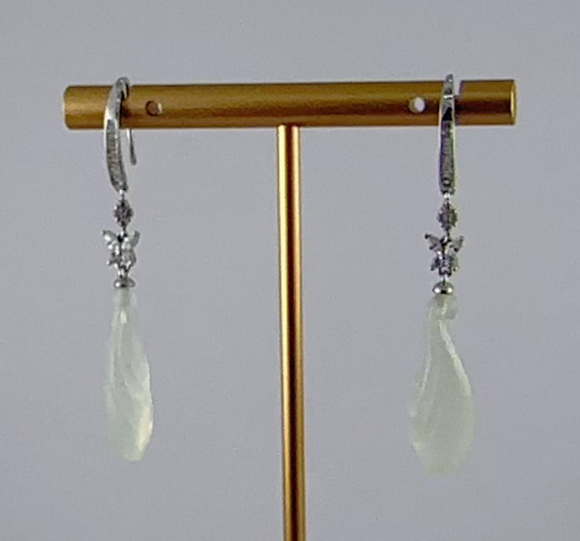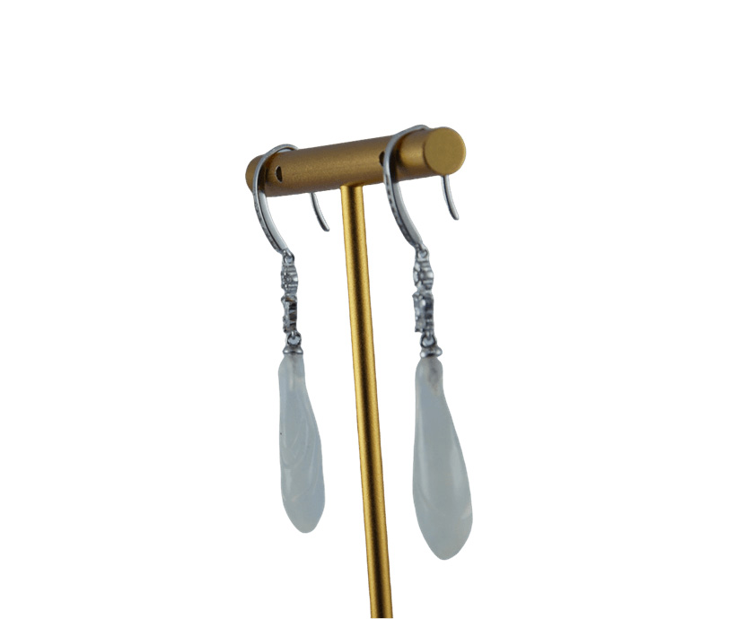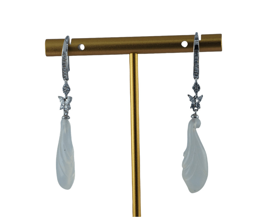 采用925银打造坚实耐用的耳钩结构,下方用四个小水钻锆石组成的菱形,连接精巧镶嵌水钻锆石的小蝴蝶。点睛与收官是一只天然玉石全手工雕刻的玉兰花悬于钻蝶之下。整件耳饰自上而下,构成了“璀璨锋芒 → 灵动生命 → 沉稳祝福”的视觉与寓意叙事。它既有钻石闪耀的现代时尚感,又有蝴蝶翩翩的浪漫艺术感,更兼玉石平安的东方文化底蕴。佩戴时,三者在耳畔形成优美的垂坠线条与光影层次,动静结合,相得益彰。