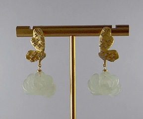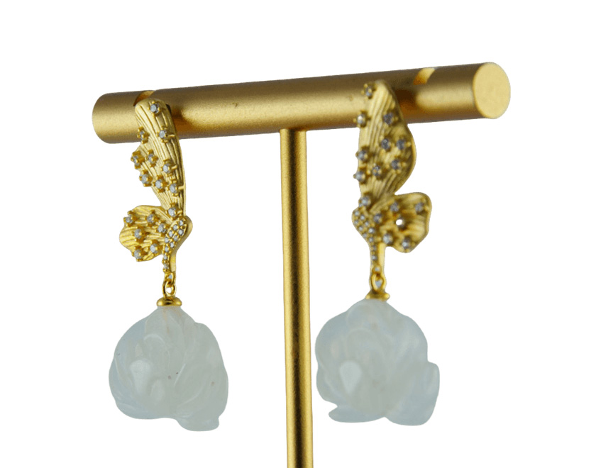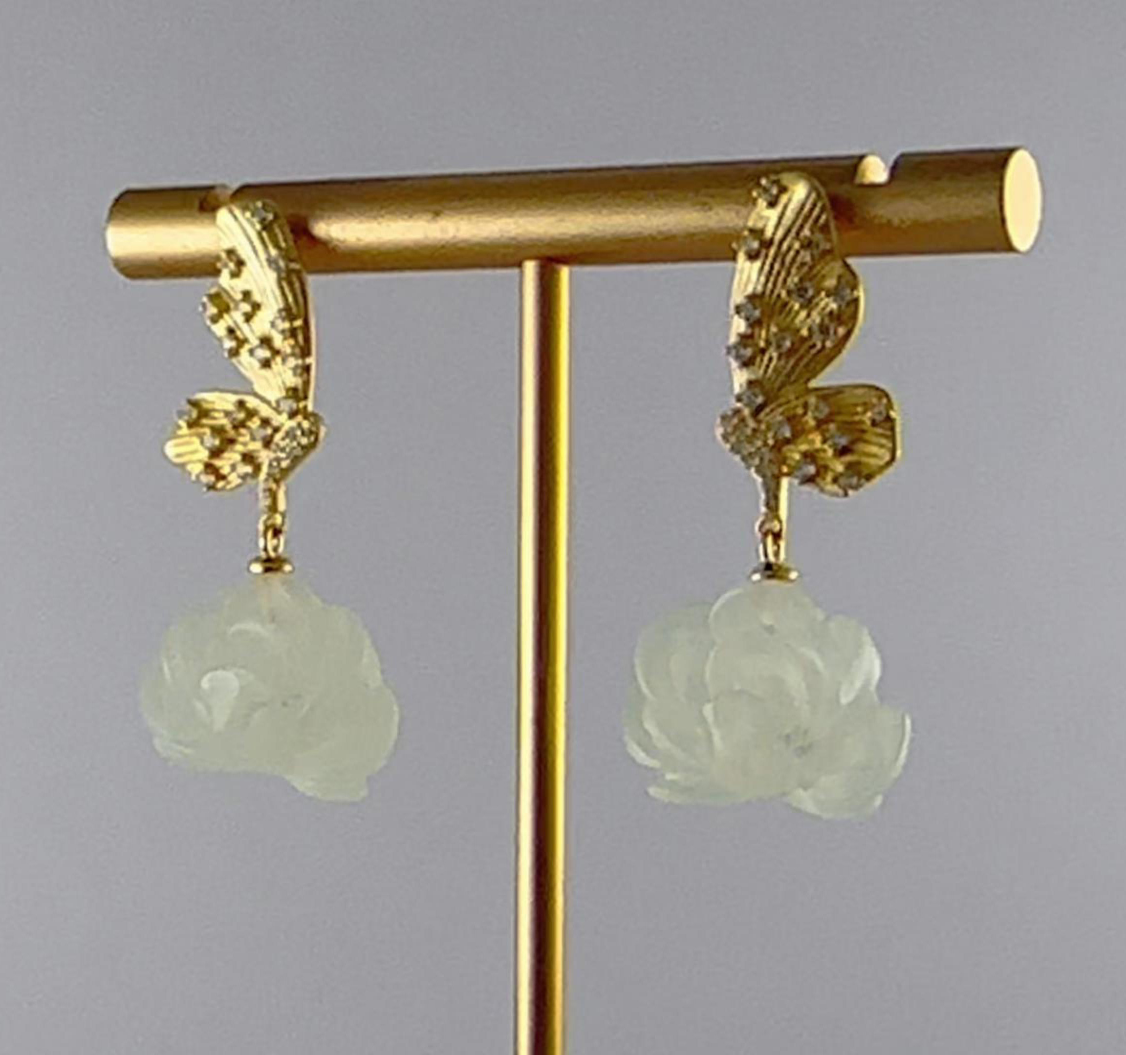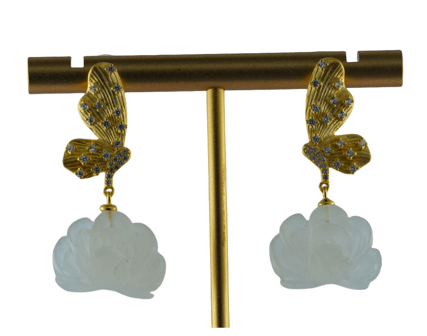 这对耳钉以飞行的蝴蝶为主造型,设计师捕捉了蝶翼翩然起舞的瞬间。整体采用优质925银锻造,匠人运用精湛的纂刻工艺,在微小的蝶翼上细细雕琢出根根分明的羽毛纹理,脉络清晰,轻盈逼真。蝶翼之上,星罗镶嵌着颗颗璀璨的小水钻锆石,为灵动的蝴蝶增添了一份精致的闪耀。蝴蝶下方,垂坠着由天然玉石手工雕刻而成的盛放牡丹。玉石温润的质感与银饰的冷冽光泽形成巧妙对比,每一朵牡丹花瓣层叠,雕刻线条流畅圆润,尽显花朵的饱满与雍容。佩戴于耳间,蝴蝶似要振翅飞去,下方的牡丹随风轻摇,动静结合,既有自然的清新脱俗,又不失华美的轻奢质感。