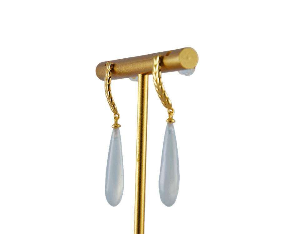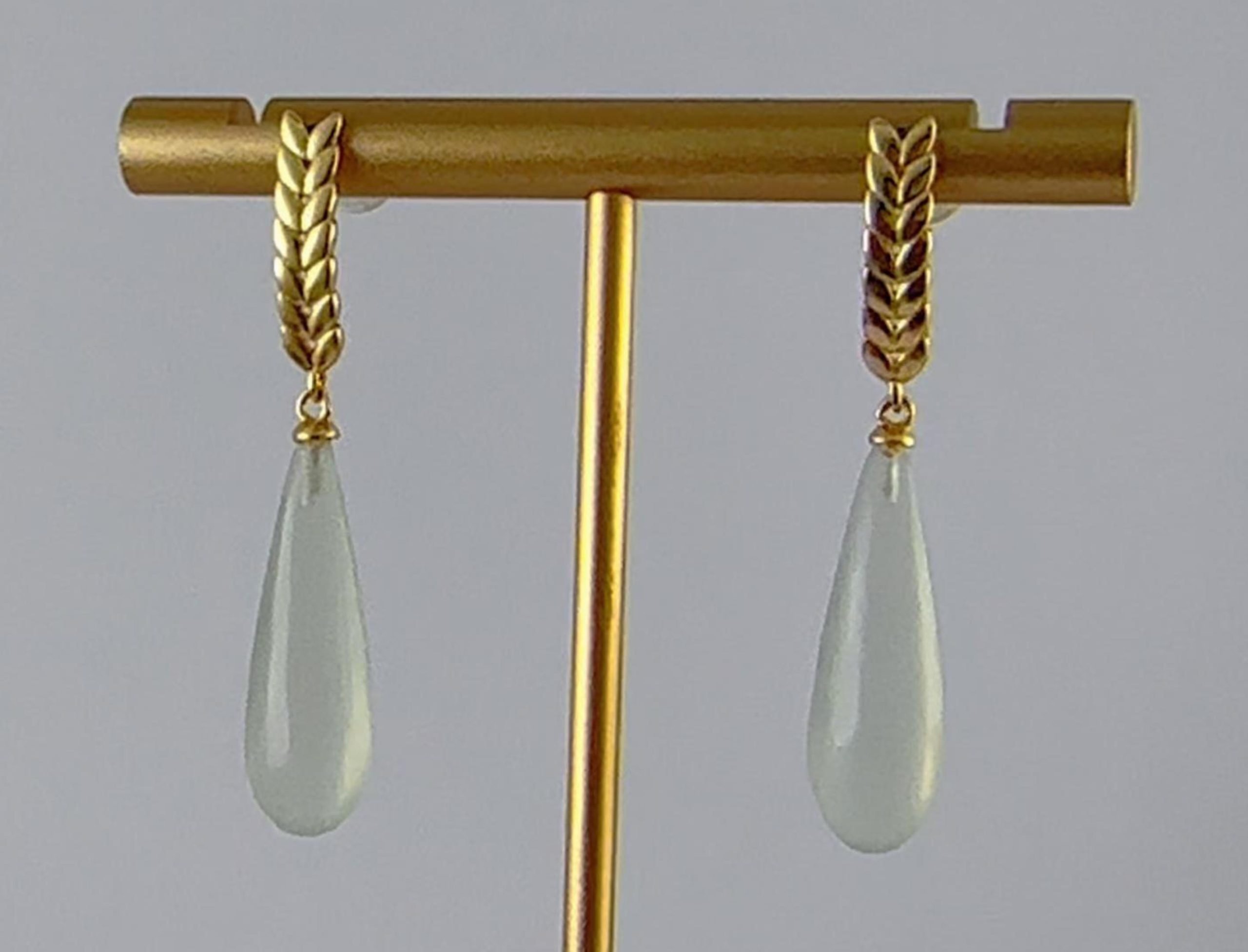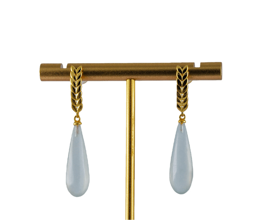 耳钉采用925银手工纂刻出立体的麦穗造型。匠人以细腻的刀法还原麦穗的自然形态——颗粒饱满,芒尖微扬。下方连接手工雕刻的天然玉石水滴,清透温润,如水珠将落未落,恰好停驻在麦穗之侧。麦穗象征丰收与富足;水滴则代表源源不断的生机。佩戴这对耳钉,是将“丰衣足食”与“生生不息”的美好祝福融入日常,亦是献给热爱生活之人的温柔礼赞。