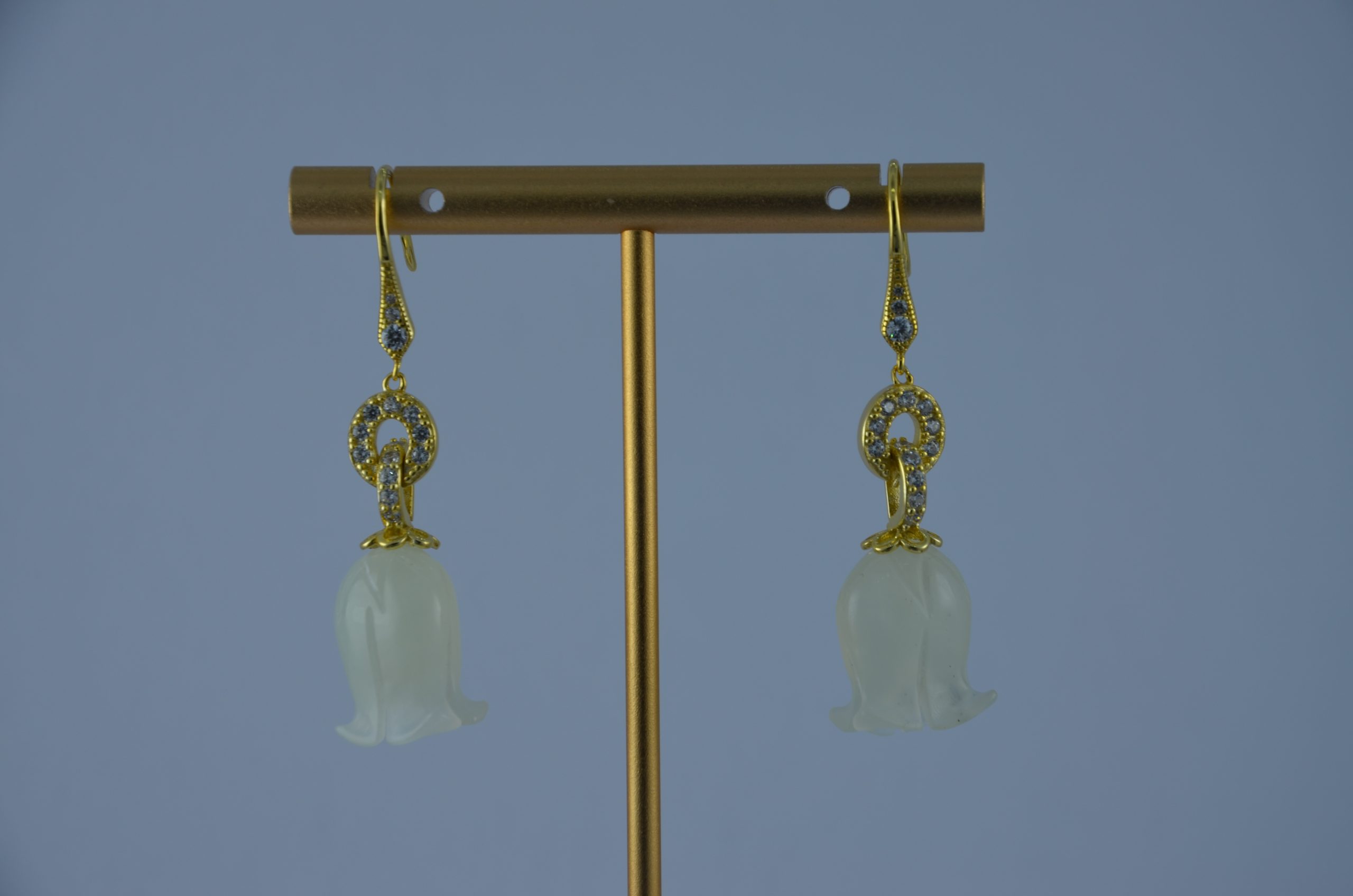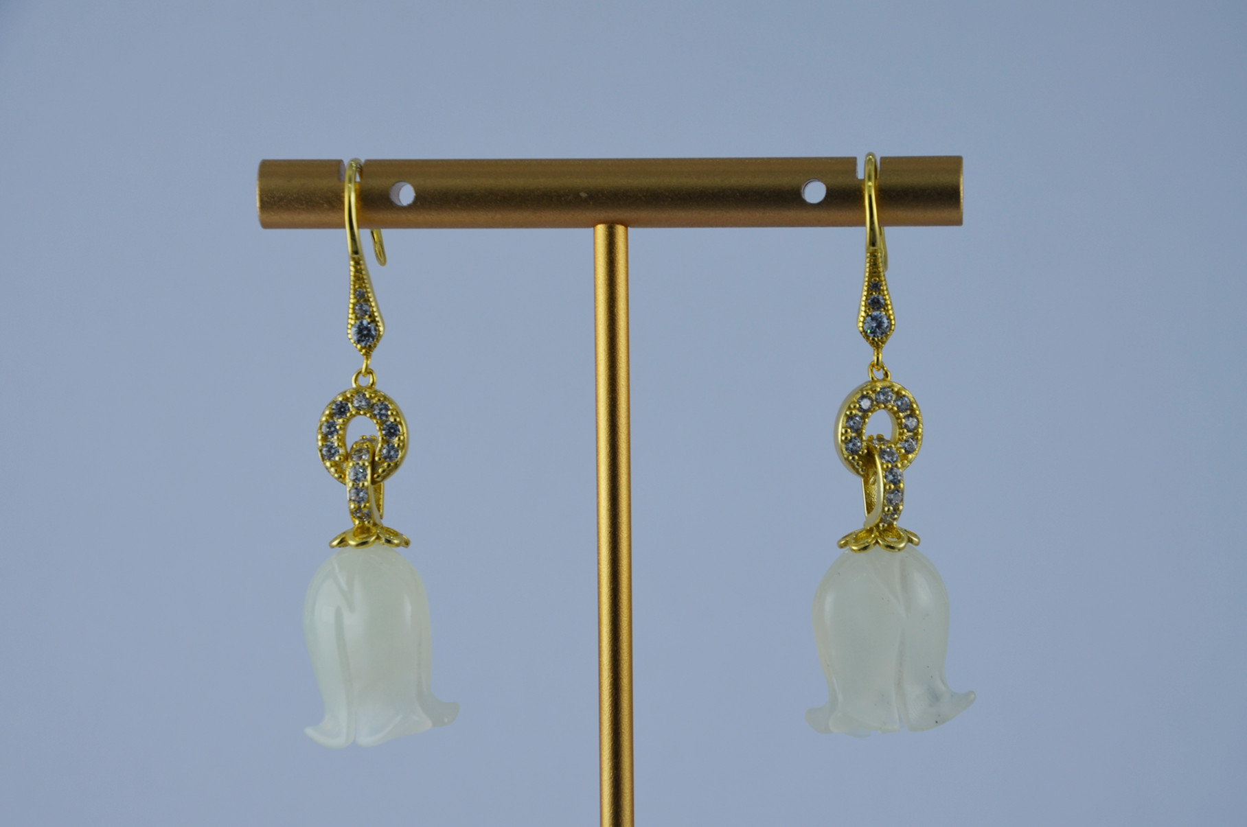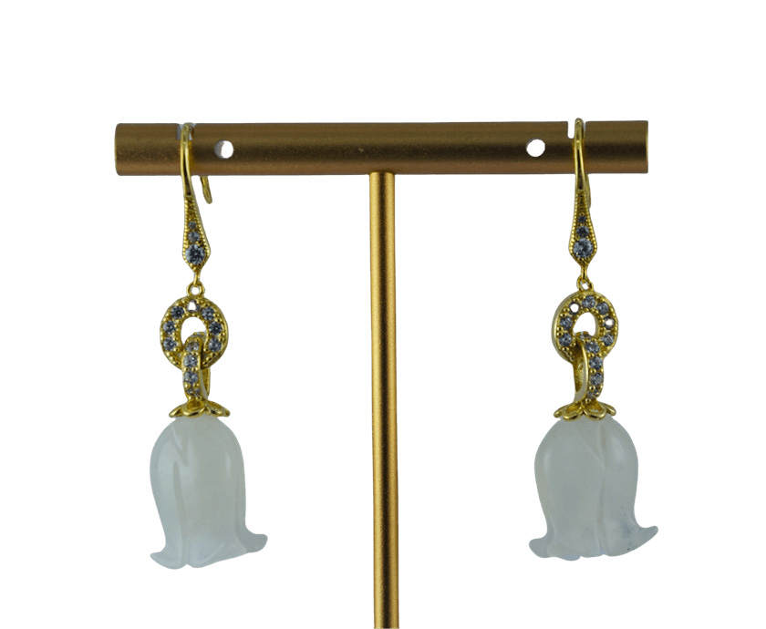 1. 耳钩以925银为基底,佩戴舒适,不易过敏。采用两连环设计,环环相扣。在连环之上满镶了璀璨的小水钻锆石,每一个角度都能折射出耀眼的光芒。下方垂坠的天然玉石,它被工匠手工雕刻成栩栩如生的铃兰花。温润的玉石质感与花瓣的柔美曲线完美融合。银与钻的闪耀,衬托着玉石的温婉,既有自然的清新脱俗,又不失精致优雅。