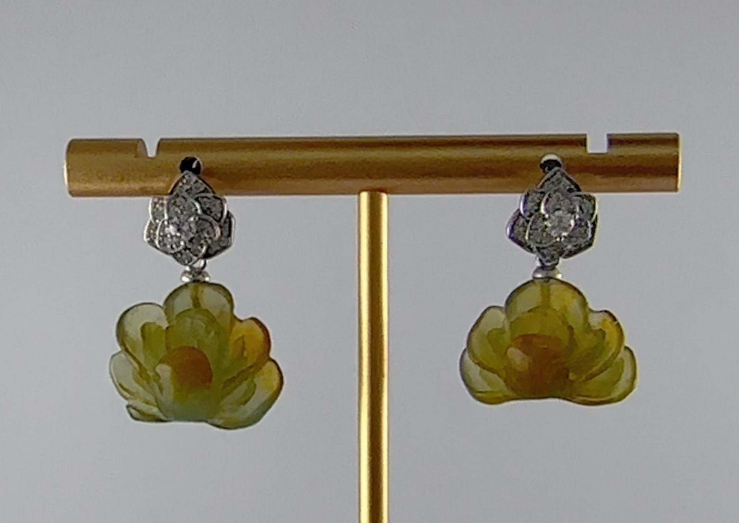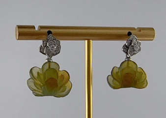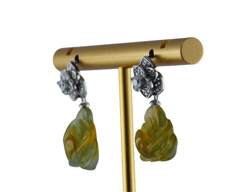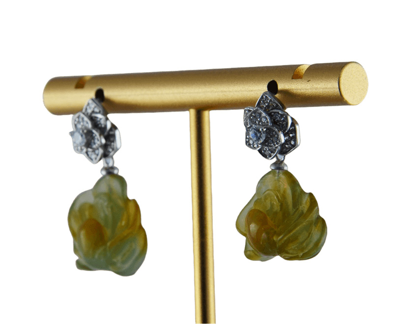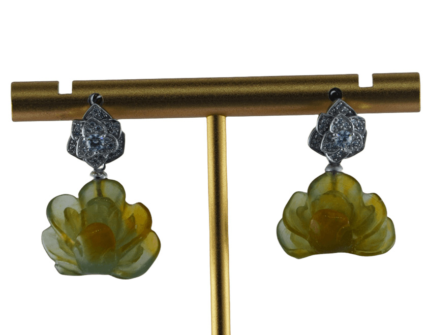 耳钉为独特的三层三瓣花设计。花朵由三个层次叠加而成,每一层均由三片花瓣错落组合,层次感极强。花瓣先用925银丝精细勾勒出外部轮廓,内部则采用密镶小水钻锆石,火彩璀璨。花朵下垂坠一枚由天然玉石手工雕刻的盛开的牡丹花。玉料色泽温润自然,牡丹花瓣雕刻层层分明,线条圆润流畅,尽显手工雕刻的独特温度与匠心。三层花瓣寓意层层绽放的美好,牡丹象征着富贵与圆满。这对耳钉既有现代设计的几何美感,又蕴含传统吉祥寓意。