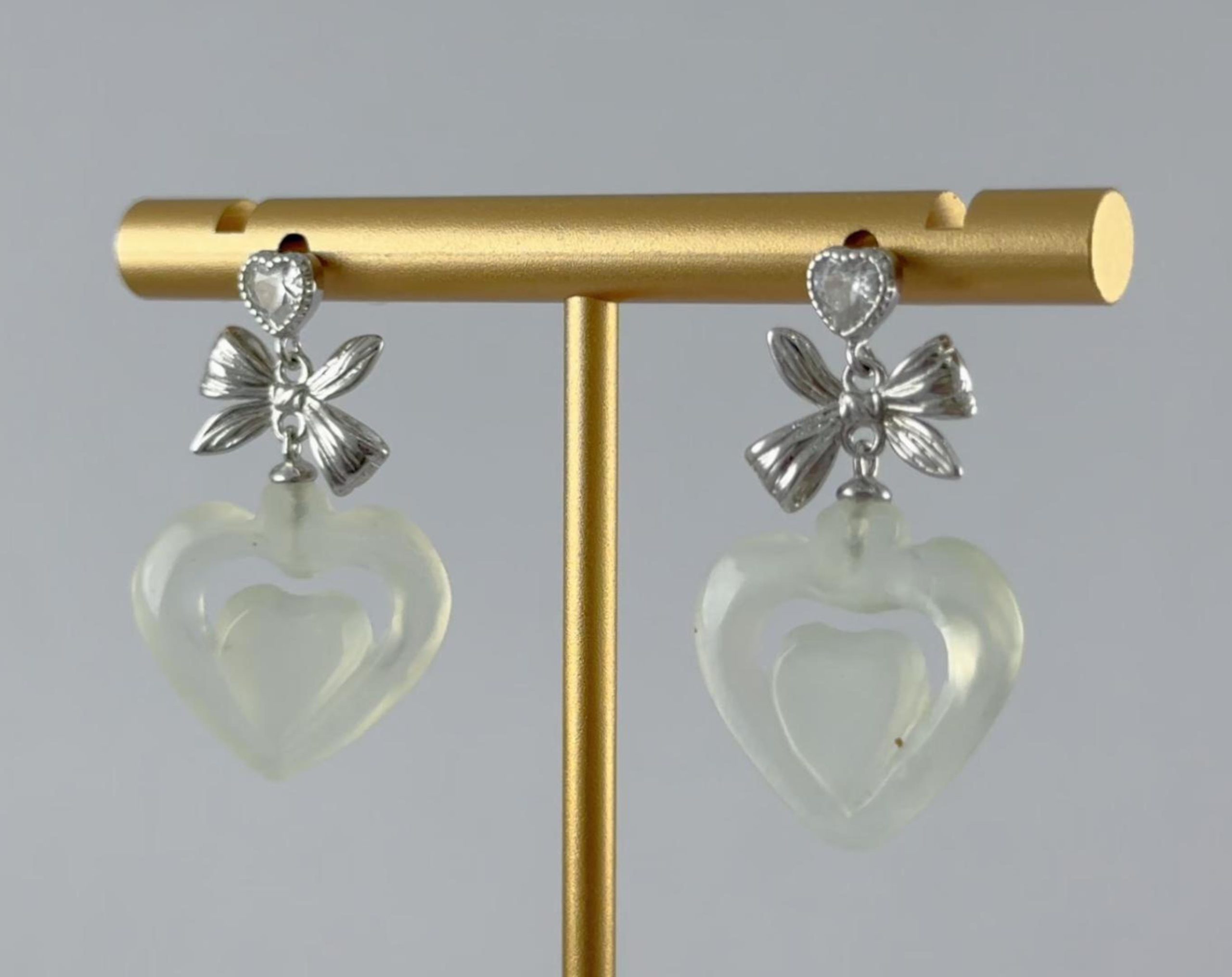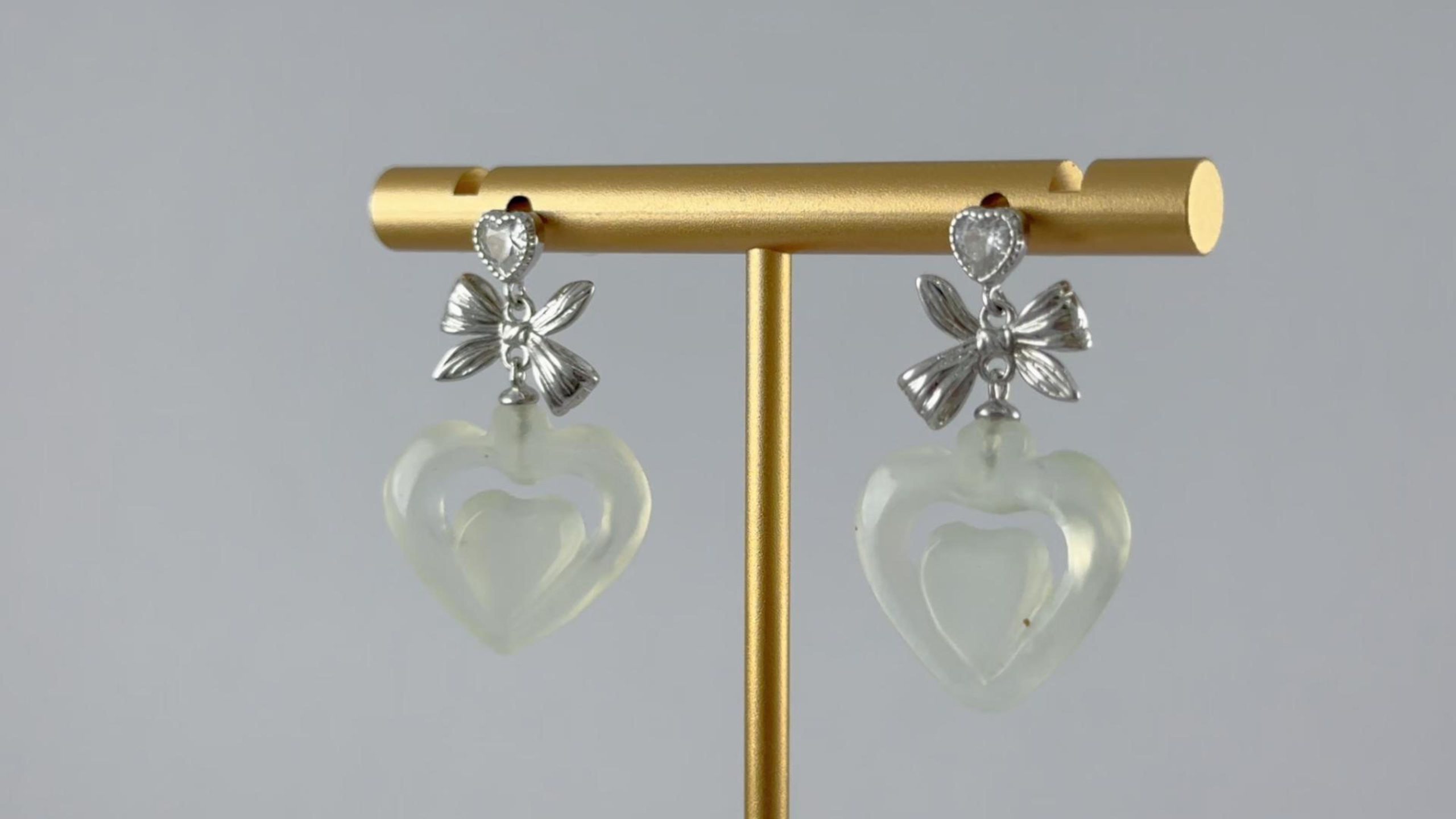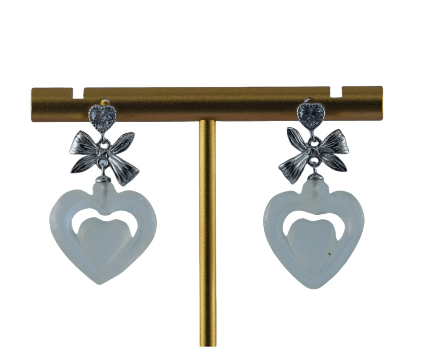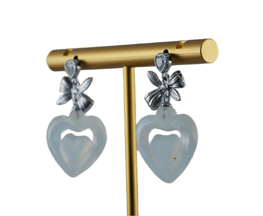 耳钉最上方是一颗璀璨的心形大水钻锆石,边缘密密镶嵌着无数小水钻,往下看,是一个用925银纯手工錾刻的丝巾结。匠人以刻刀在银质表面细细雕琢,打造出丝巾特有的柔韧褶皱感与编织纹理。下面精选天然优质玉石,全手工立体雕刻成饱满桃心。它温润内敛,不事张扬,却最是耐看。那是历经岁月沉淀后,依然不变的初心。