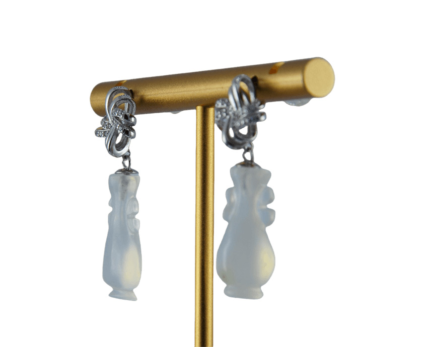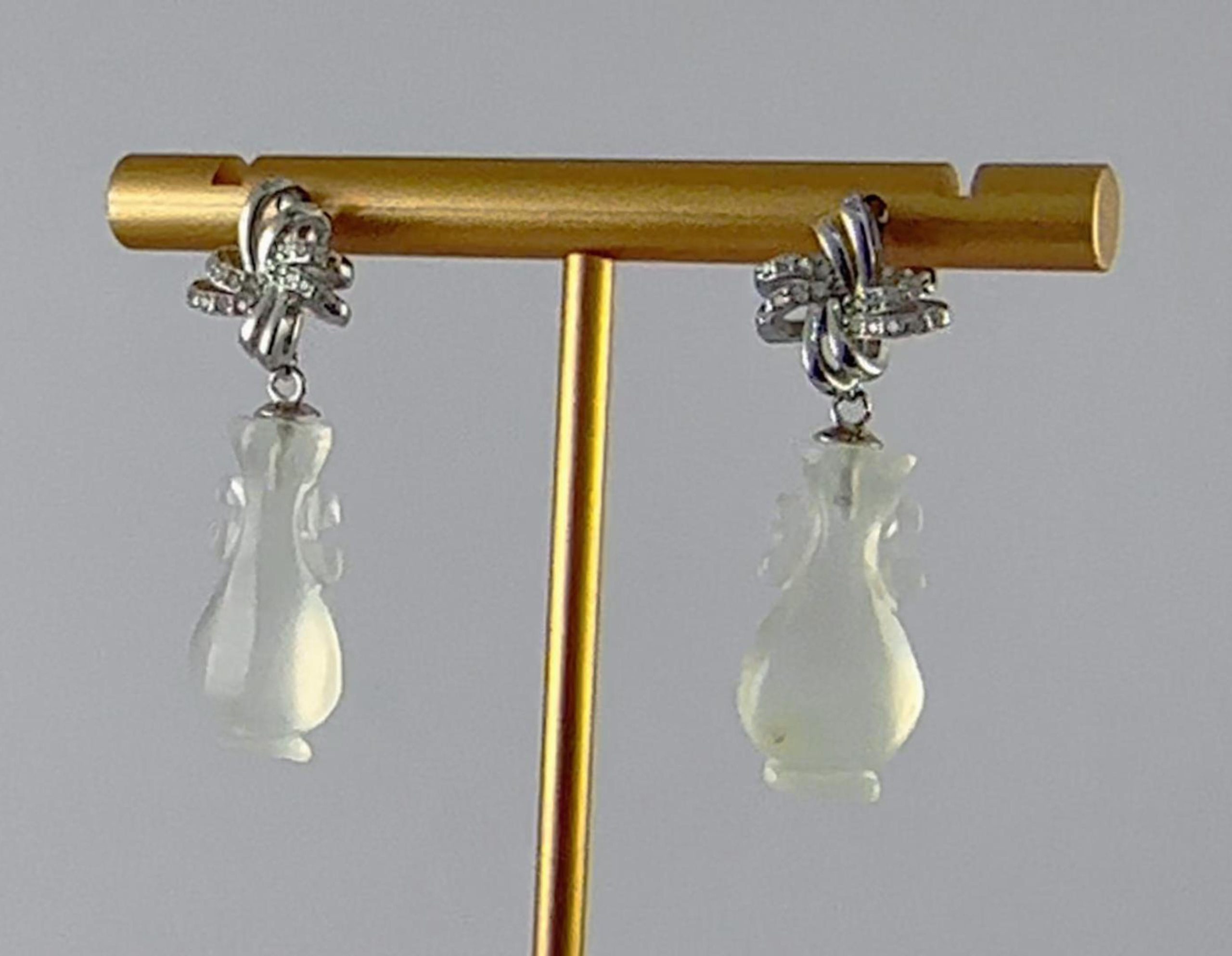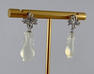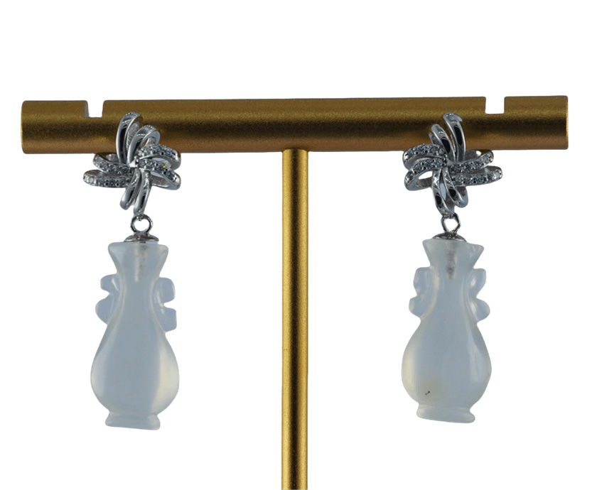 设计师将传统中国结的“盘扣”元素进行现代化演绎,用925银以双股丝带的柔美曲线勾勒出耳畔的灵动感。对向而行的丝带上密镶高光泽度微镶水钻,璀璨如星河,瞬间提亮肤色。下面精选优质天然玉石,手工雕刻成立体如意瓶造型 。玉石质地细腻,色泽温润饱满,晶体内部有自然的棉絮或纹路,这是天然产物的独特身份证 。造型饱满圆润,寓意平安如意。