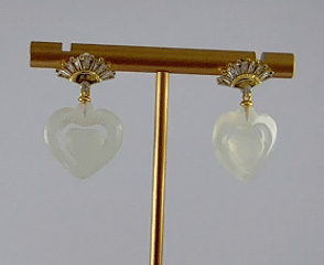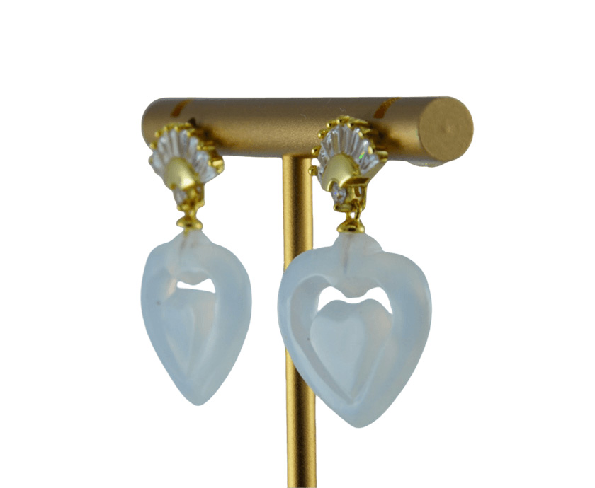 耳钉采用S925银打造,亲肤不易过敏。顶端是十字造型,满镶嵌着小水钻锆石。下部分的“伞帽”为工艺难点,采用传统纂刻与花丝技法,制作出细腻精致的金属纹理,赋予作品灵动的层次感与呼吸感。伞下方连接着一枚由天然玉石手工雕刻而成的桃心。匠人用巧手将玉石打磨成饱满圆润的造形,色泽温润,触感莹滑。它像是一颗藏不住的真心,随着你的步伐轻轻摇曳,时而藏于扇后,时而探出头来,演绎着欲说还休的小女儿情态。