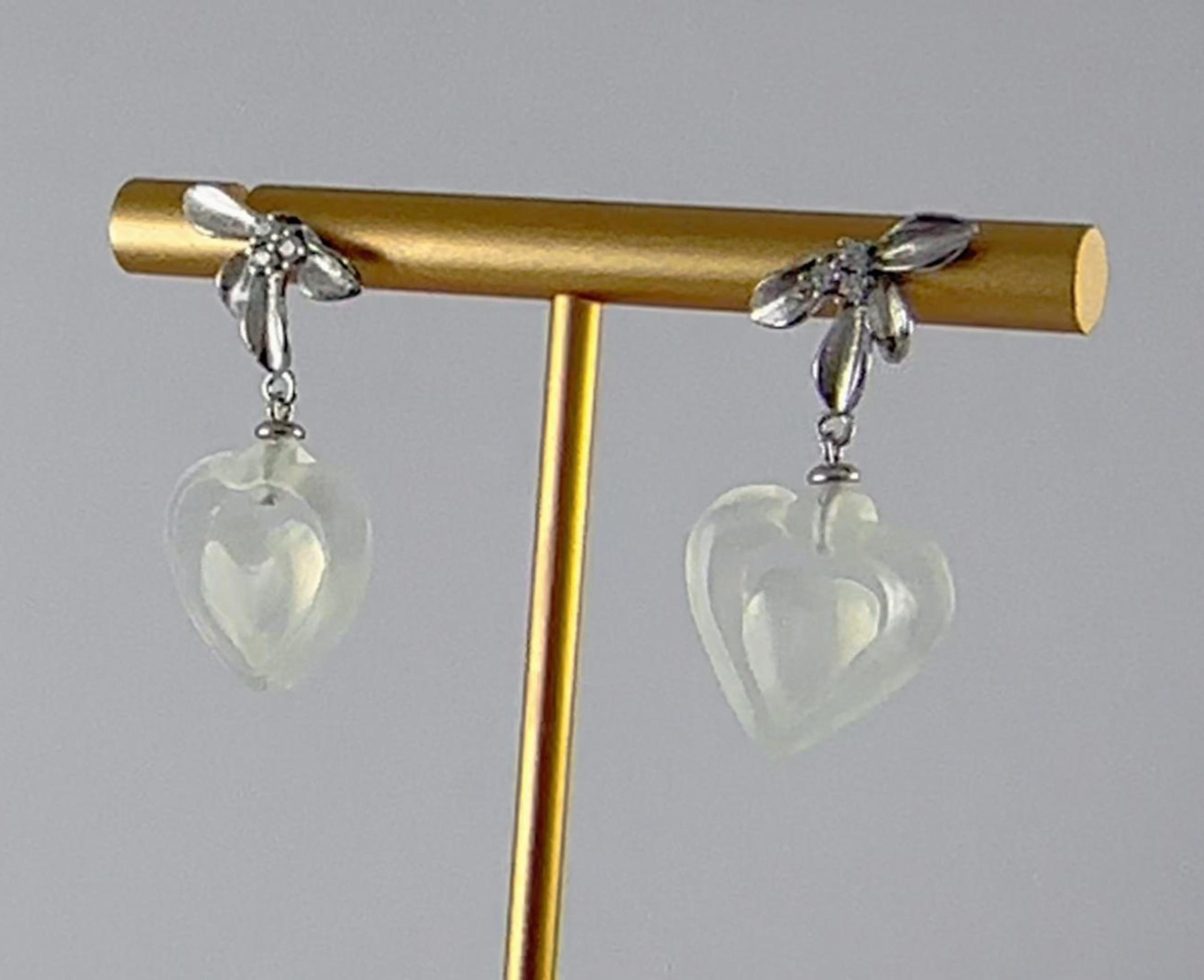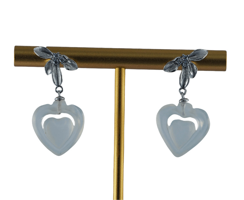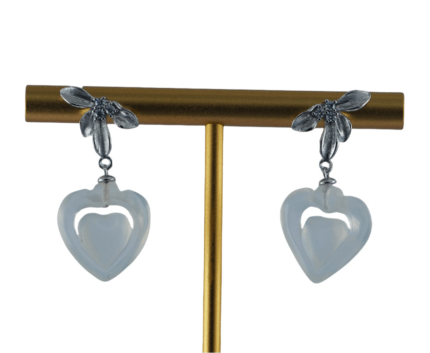 这款耳钉以925银锻造出四枚形态舒展的弧形花瓣。银质表面经细致抛光,呈现出柔润的哑光质感,使花瓣既有金属的挺括,又不失花朵的娇柔姿态。花心处,三颗澄澈的小水钻锆石聚拢镶嵌,恰似晨露凝于花蕊。花瓣之下,一枚由天然玉石手工雕刻的桃心安然垂坠。造型饱满圆润,线条流畅素雅,承载着“心心相印”的朴素祈愿。它是一件兼具东方祥瑞与现代简约的日常首饰,适合在每一个需要被温柔祝福的时刻佩戴。