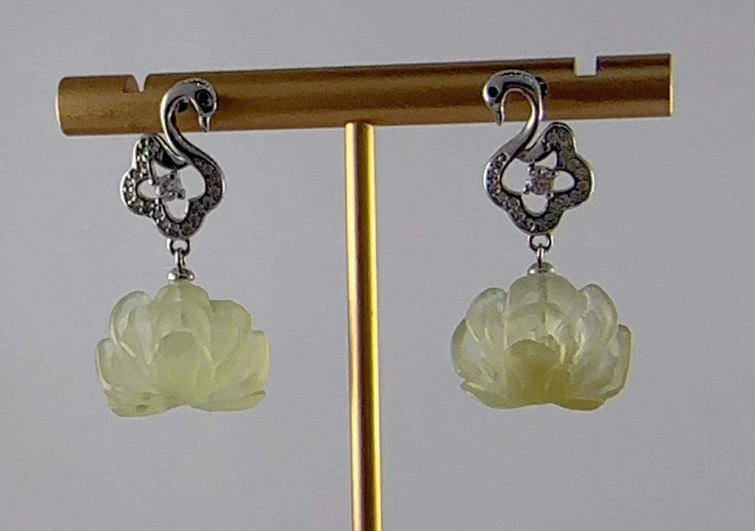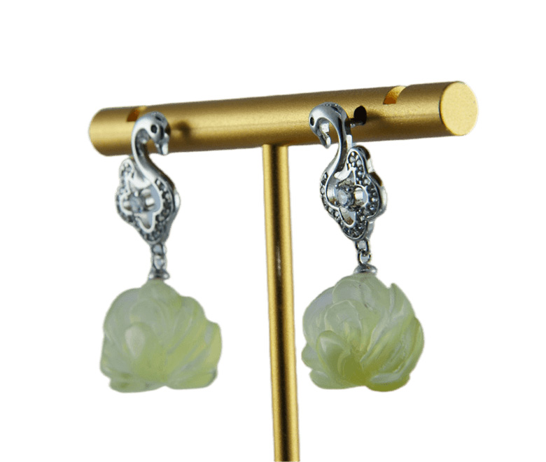 这款耳钉以925银条细腻勾勒出天鹅的优雅轮廓——修长的颈项划出水面的柔美弧线,高贵而纯净。天鹅身上密镶璀璨水钻,随着步履轻摇,闪耀出星河般的光芒。天鹅之下,连接由天然玉石手工雕刻而成的盛放牡丹。匠人以刀代笔,将玉石的温润化作层层叠叠的花瓣,牡丹花型丰盈,脉络清晰。玉石天然的色泽与纹理,让每一朵牡丹都独一无二。上有天鹅起舞的纯净与高洁,下有牡丹盛开的繁华与圆满。佩戴于耳畔,仿佛将一份“忠贞相伴、富贵长久”的美好祝愿,轻轻诉说。