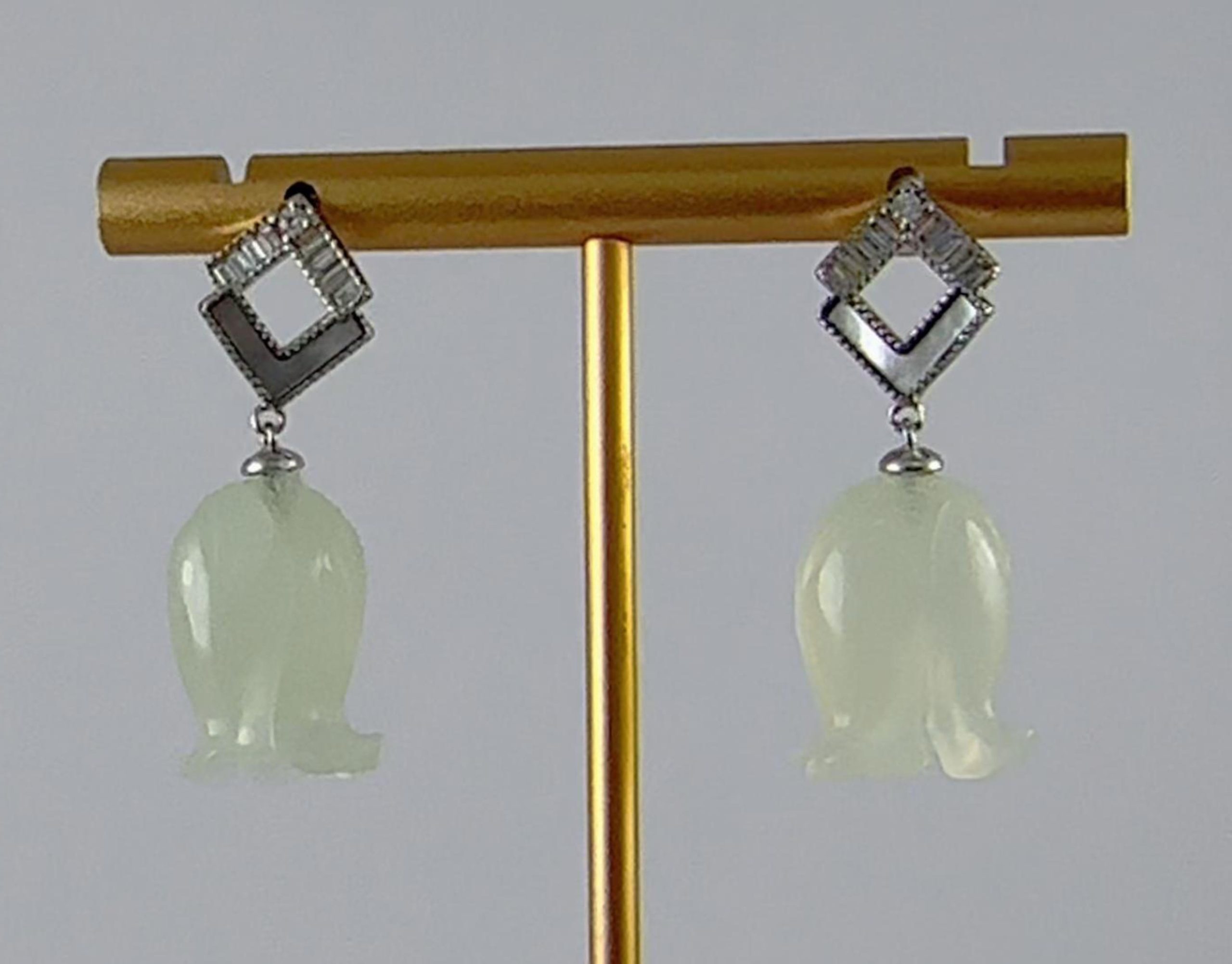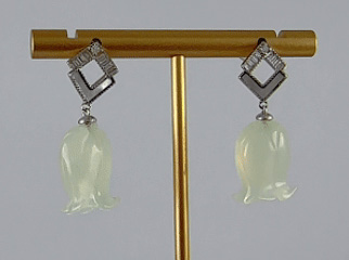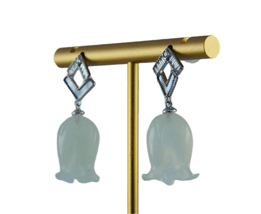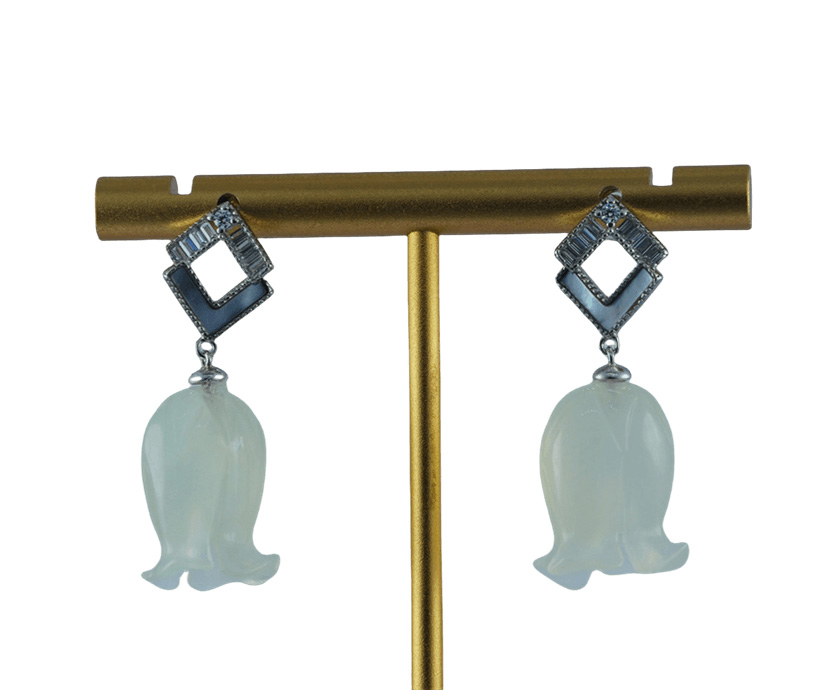独创的双L造型宛如一对优雅的羽翼,又似相互依偎的剪影。上翼密镶水钻,捕捉并散射每一缕光线,闪耀如晴空下的冰晶;下翼镶嵌天然贝壳,其独特的虹彩光泽随角度流转,温润如月华浸润的珍珠。双翼之下,悬坠着一颗精心雕琢的天然玉石铃兰花。玉石不语,却自有千言:澄澈如冰,每颗玉都承载着独一无二的自然印记。