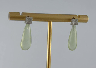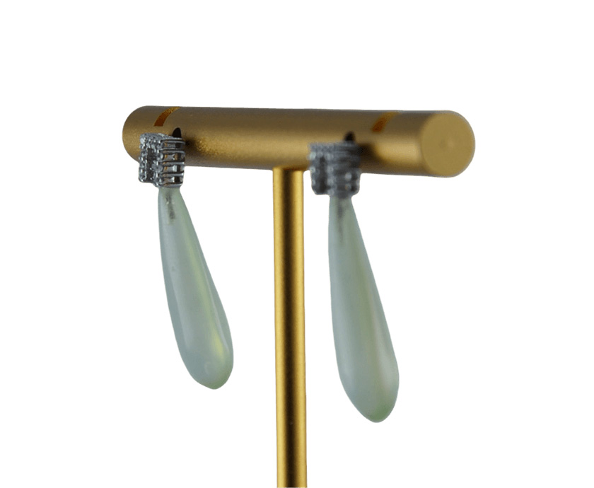 这款耳钉以925银为骨,精工打造出简约现代的正方形轮廓,密镶璀璨水钻锆石紧密排列,光芒灵动而夺目。正方形的底端坠着一枚天然玉石手工雕刻的细长水滴。手工雕刻的痕迹保留了玉石最动人的天然韵味。正方形水钻的闪耀,是面向世界的璀璨宣言;而静逸垂落的细长水滴,则是回归内心的平安寄托。