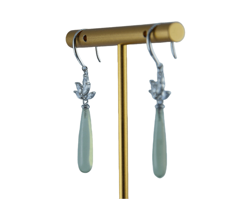 耳钩用925纯银勾勒出枝桠自然分叉、舒展的形态,在于枝梢上镶嵌的数颗精选大颗粒水钻。树根是一枚天然玉石手工雕琢的水滴。如同树根承接了整夜星光与晨雾后,凝结出的第一滴甘露。树冠向上探索天空,汲取星光;水滴向下回归大地,凝结精华。这组耳饰,构建了一个微型的、完整的能量循环。它寓意着佩戴者既拥有如树般向上生长的力量与野心,在现实世界开枝散叶,光芒四射;又保有如水滴般纯净透彻的内心与智慧,懂得沉淀与回归。