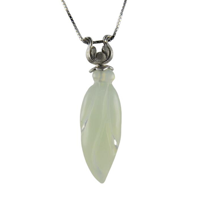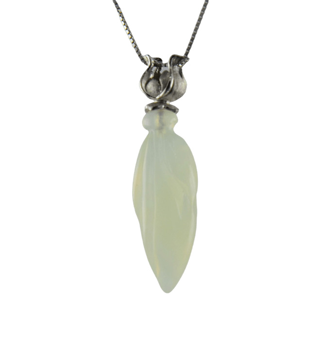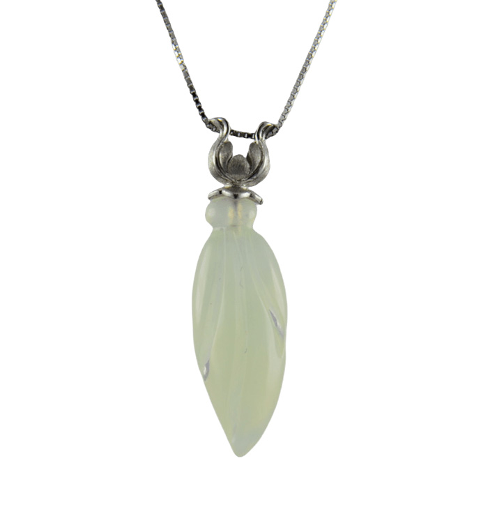 2. 银色玫瑰花形吊环上连接大玉兰花,吊环采用古法雕刻手法,给人古朴清爽的感觉。