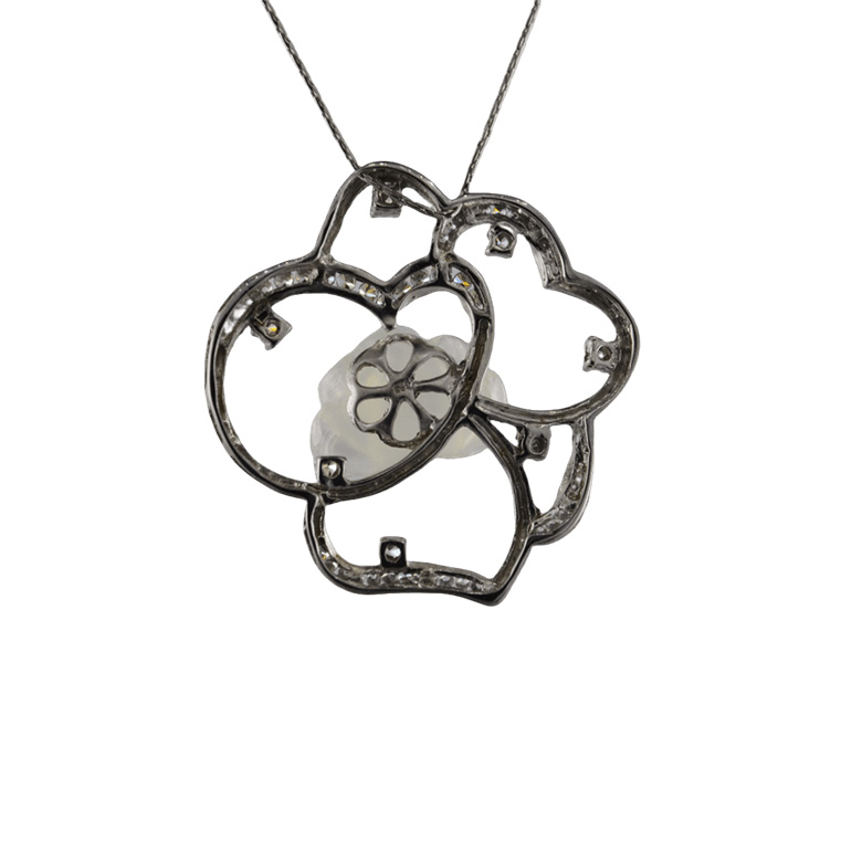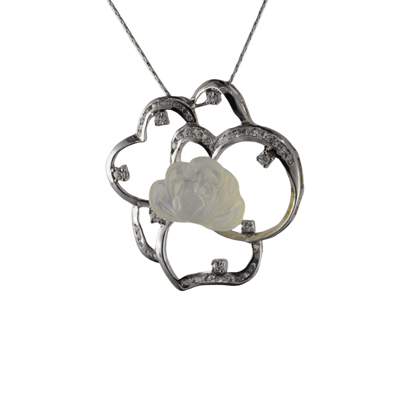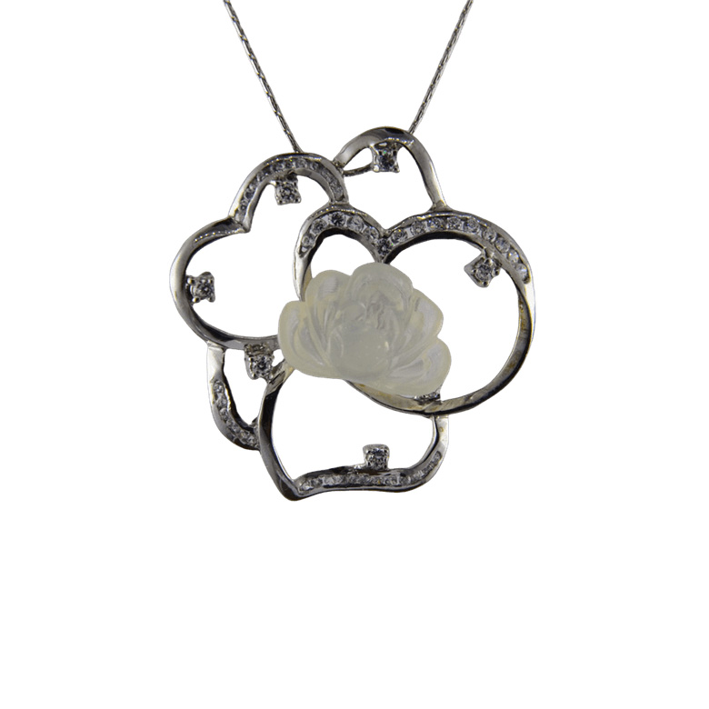 3. 银色睡莲上采用古法雕花纹并镶嵌小水钻,内配上立体5层小牡丹花,使牡丹花与睡莲叶浑然一体。