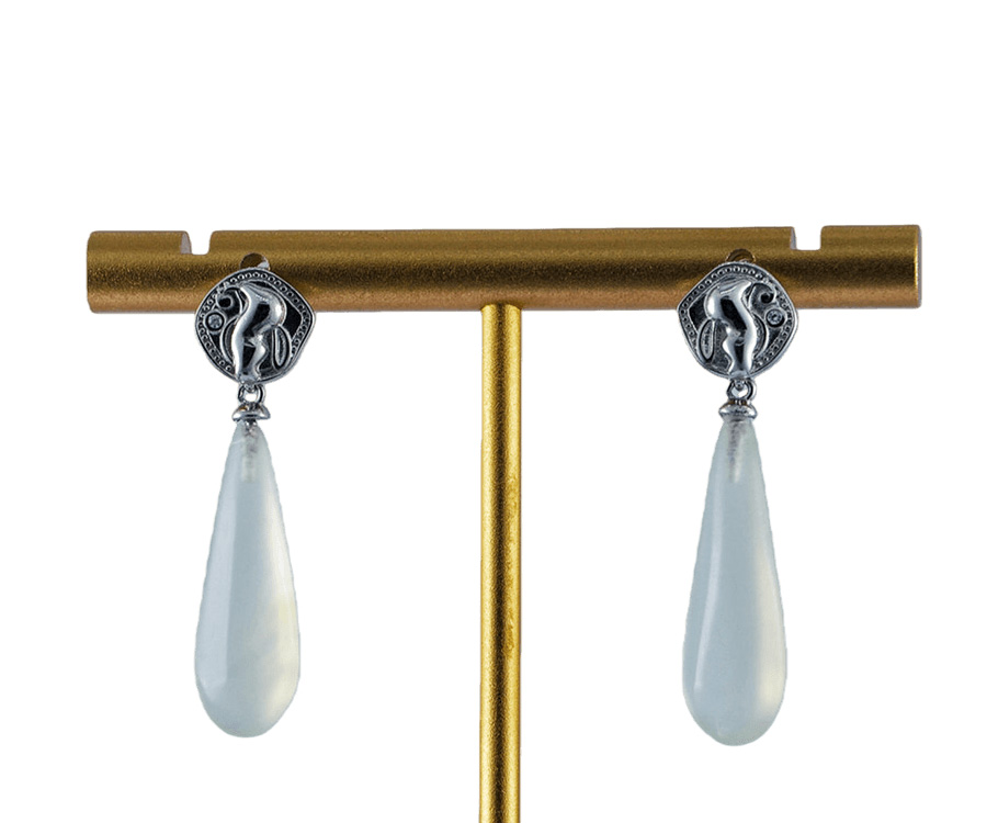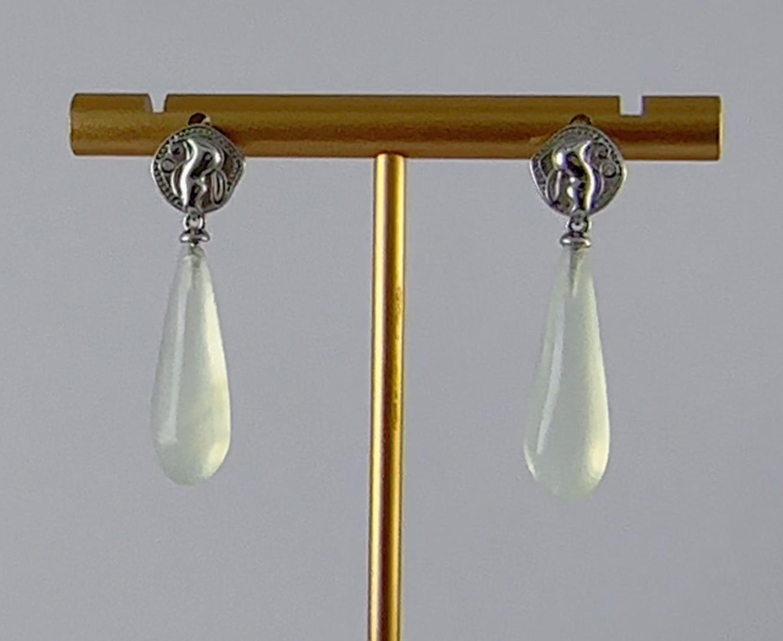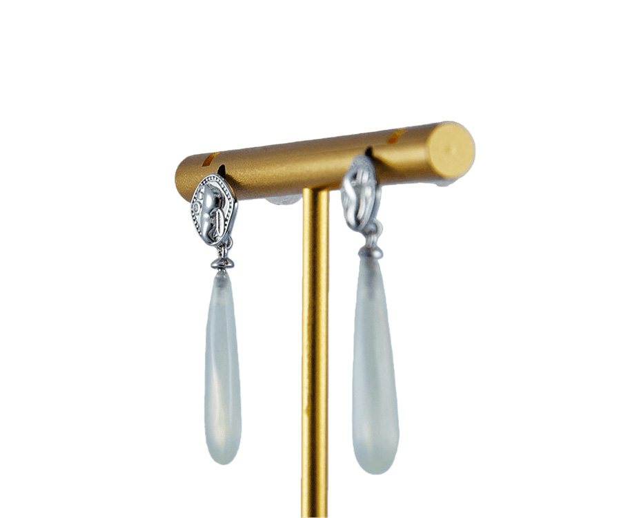 1. 耳钉采用925银丝,经由匠人手工纂刻,打造出立体的精灵造型。她仿佛刚从晨露中苏醒,灵动的身姿与微绽的羽翼在光影下栩栩如生,每一道纹路都倾注了手工雕琢的温度与灵魂。下方悬坠的,是一枚经由手工精磨的天然玉石。匠人依照原石的自然纹理,将其细细打磨成饱满的水滴形态,保留了玉石最温润原始的触感。玉石与银饰的相遇,是金属光泽与自然矿物的和谐共鸣。