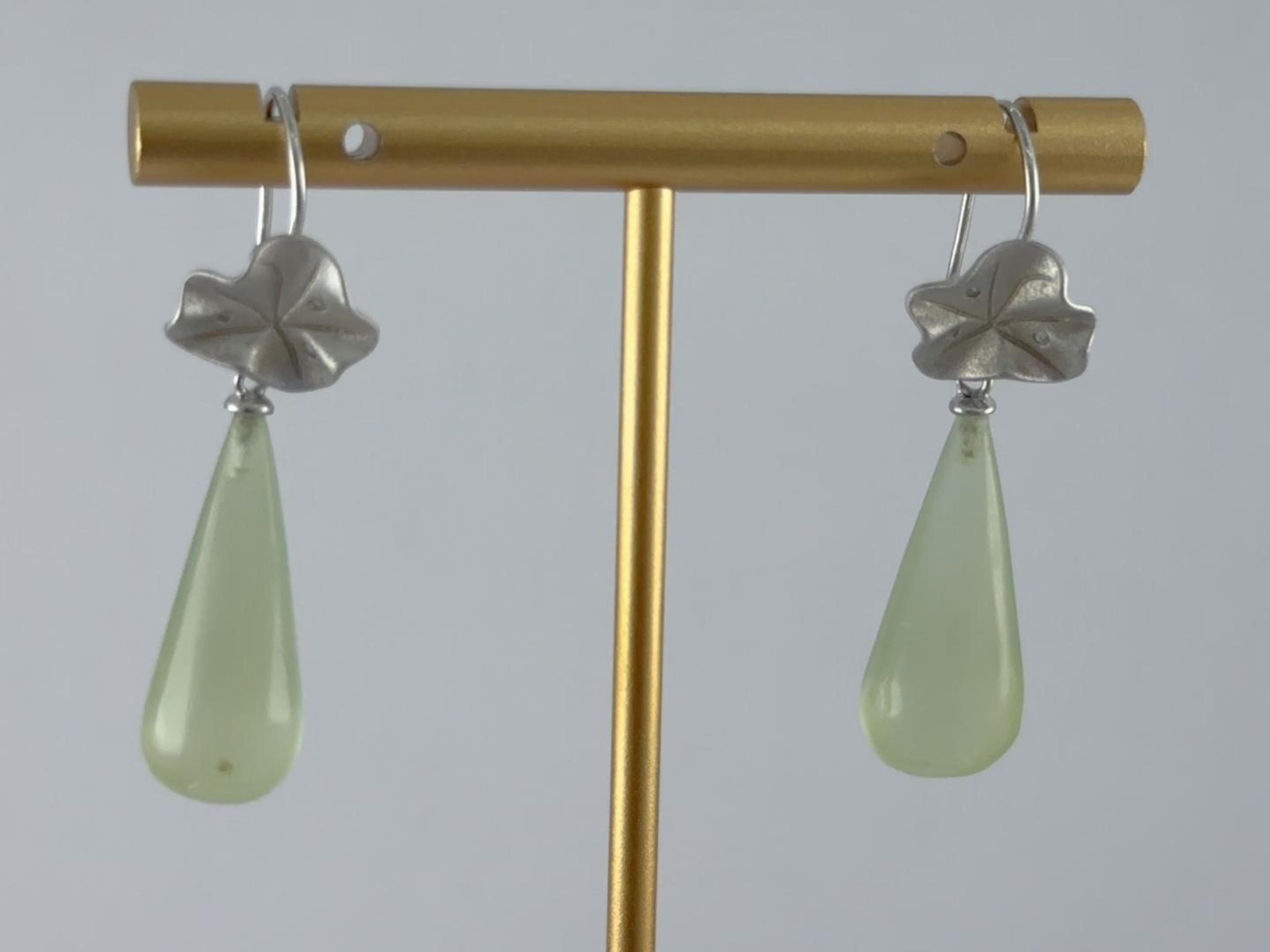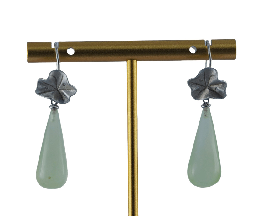 耳钩与一片立体的925银荷叶相连。匠人通过细腻的锻造与錾刻,再现了荷叶自然的卷边与起伏的脉理。它并非完美对称的工笔,而是带着手作的随性之美。荷叶下是一枚天然玉石手工雕刻而成的水滴。匠人依据玉料的原生形态与色泽,磨砺出饱满、圆融的水滴造型,线条流畅得仿佛下一秒就要滑落。佩戴这对耳环,仿佛将一片静谧荷塘与一滴永恒清露藏于耳畔,在步履匆匆间,提醒自己保持内心的清澈与柔软,于纷繁世界中,守住一方自在的清凉。