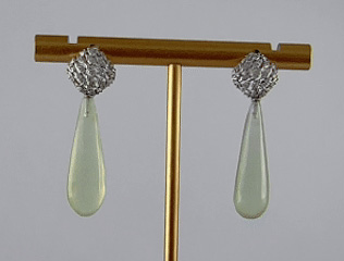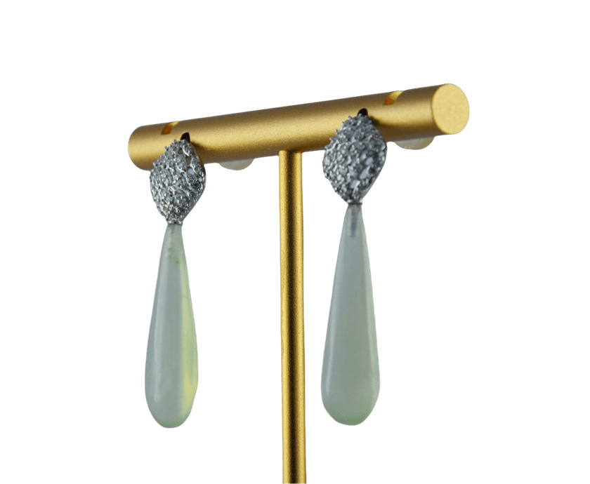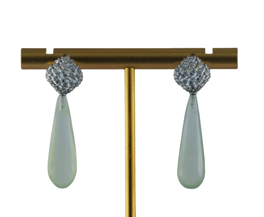 网下轻悬的天然玉水滴,是整件作品的静谧之心。手工雕刻最大限度地保留了玉石的天然纹理与温润气质,其形态圆融欲滴,色泽清雅恬淡,仿佛在喧嚣闪耀之上,始终保有一份沉静的呼吸与自然的温度。