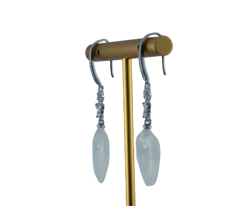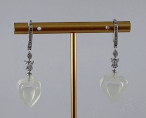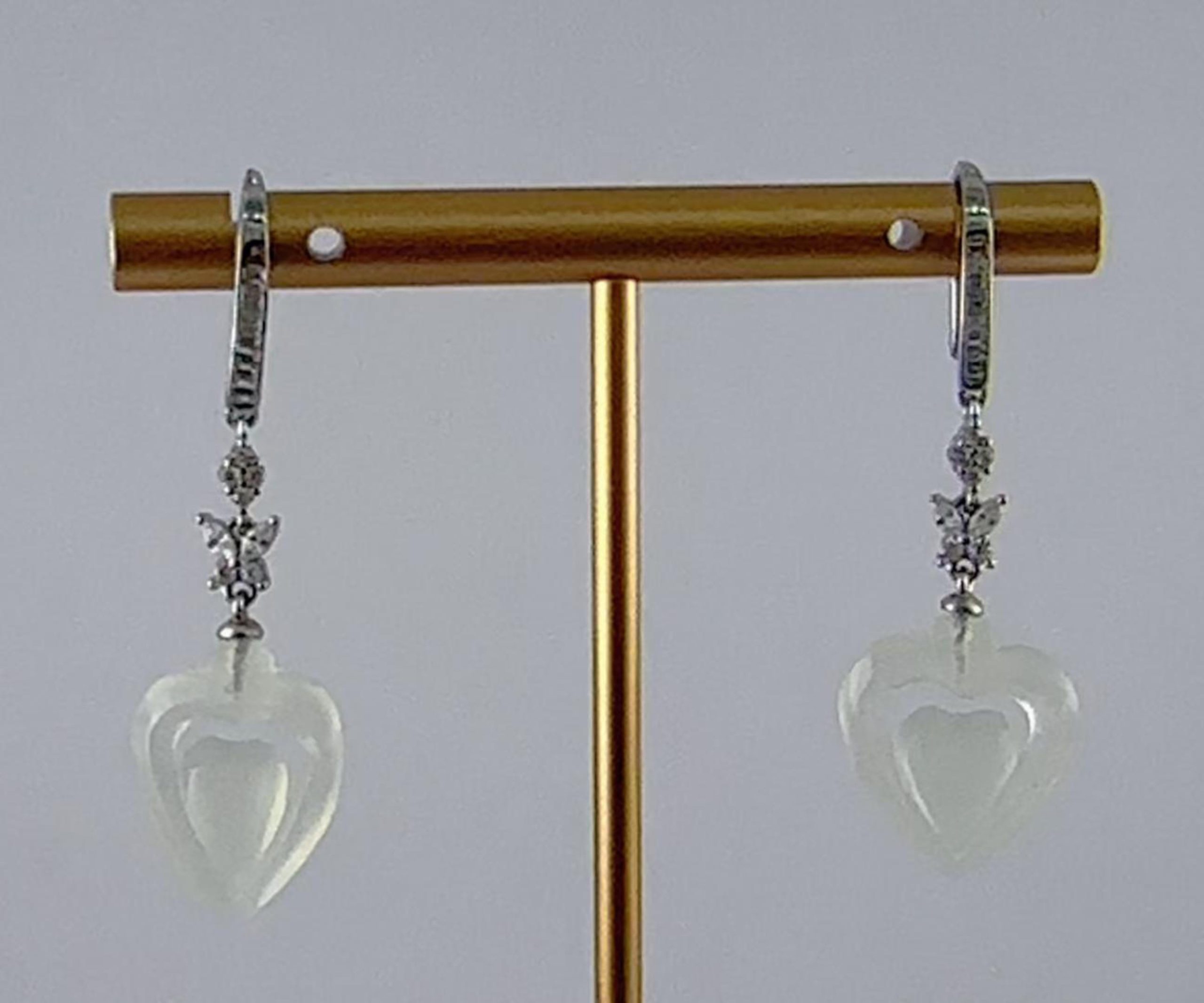 采用925银打造坚实耐用的耳钩结构,下方用四个小水钻锆石组成的菱形,连接精巧镶嵌水钻锆石的小蝴蝶。点睛与收官是一只天然玉石全手工雕刻的桃心悬于钻蝶之下。整件耳饰自上而下,构成了“璀璨锋芒 → 灵动生命 → 沉稳祝福”的视觉与寓意叙事。它既有钻石闪耀的现代时尚感,又有蝴蝶翩翩的浪漫艺术感,更兼玉石平安的东方文化底蕴。佩戴时,三者在耳畔形成优美的垂坠线条与光影层次,动静结合,相得益彰。