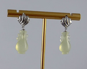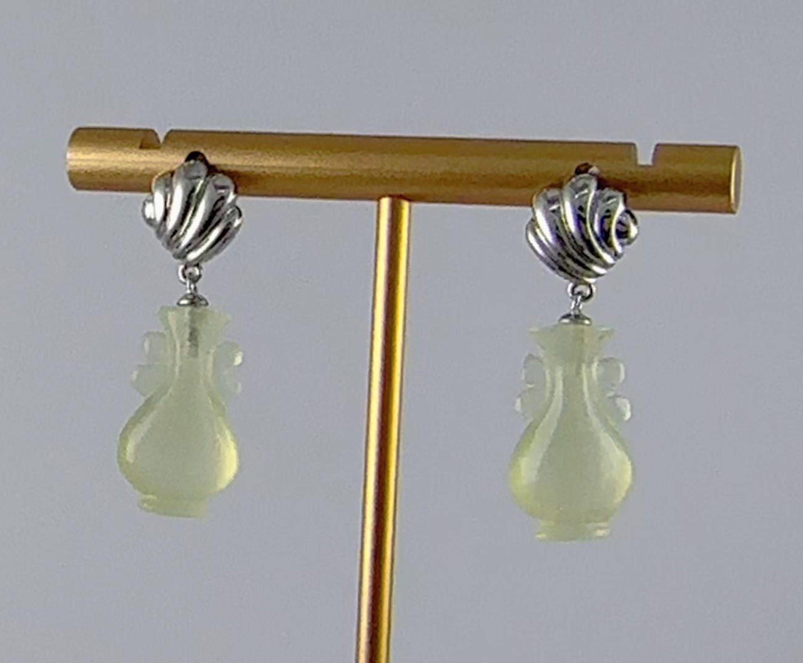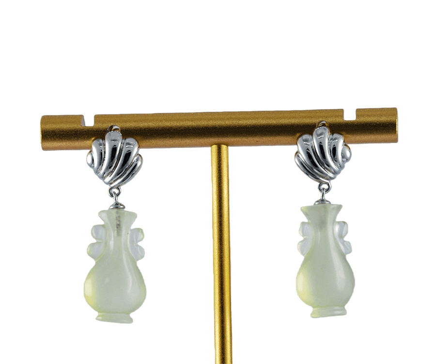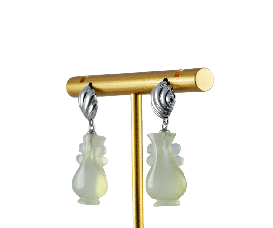 对耳环,上部采用925银精心锻造,匠人以细腻的刻刀,在银质表面纂刻出贝壳天然的细密纹理——一道道深浅有致的纹路,真实而生动。银贝之下,连接着另一枚由天然玉石手工雕刻而成的如意瓶。玉的温润被匠人巧手雕琢成玲珑的瓶形,与上方的银贝遥相呼应。当银的冷冽遇见玉的温润,当雕刻的纹理遇见天然的质感,便成了这对耳环最动人的语言。佩戴于耳际,随着步履轻轻摇曳,仿佛能听见远方的潮汐,一声一声,都是心动的回响。