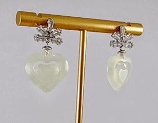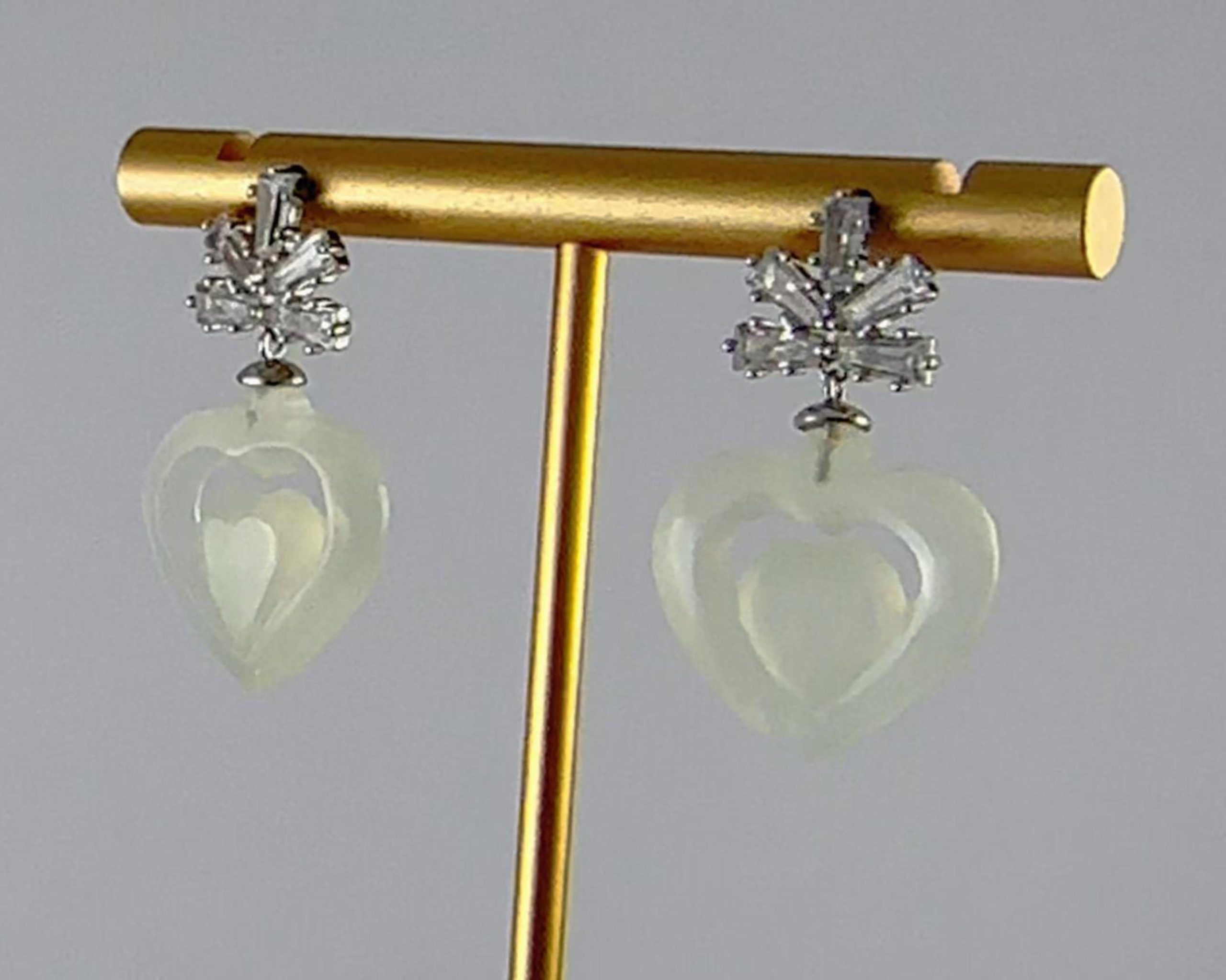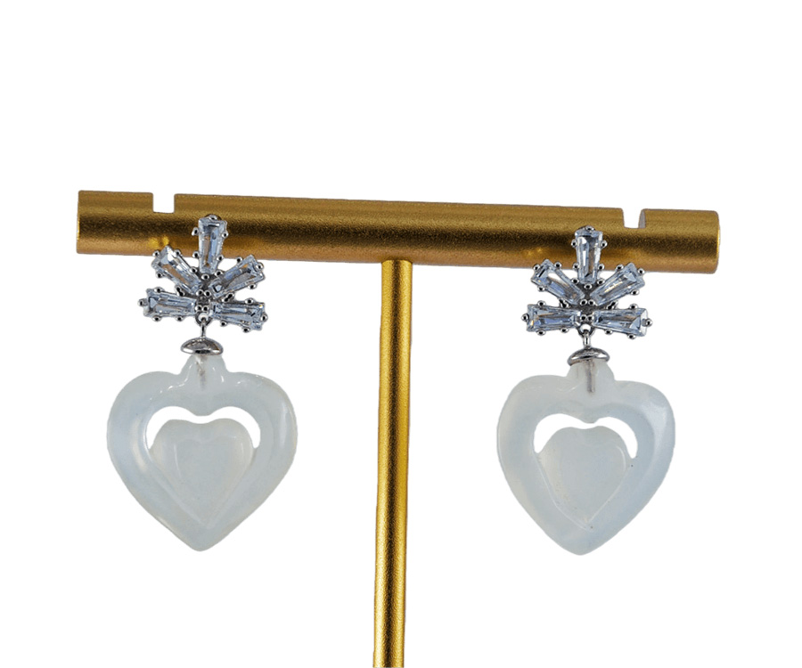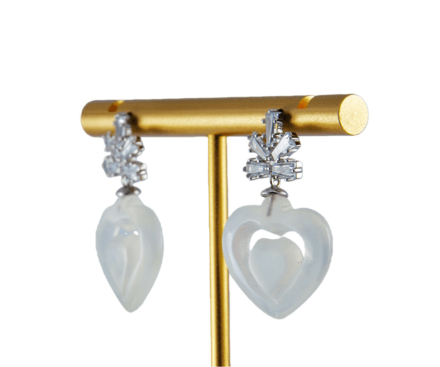 耳钉以925银为基底,五颗璀璨的长方体大水钻锆石镶嵌成花冠形,与下方天然玉石纯手工立体雕刻成桃心造型相连。桃心线条柔美,层次分明。匠人通过深浅不一的刀法,赋予玉石灵动的生命力,都独一无二,不可复制。作品将璀璨花冠的华美与桃心的清雅巧妙融合,通过满钻镶嵌的闪耀与天然玉石的内敛形成质感碰撞,既有轻奢品的精致感,又有日常佩戴的百搭性。