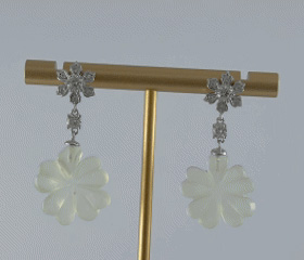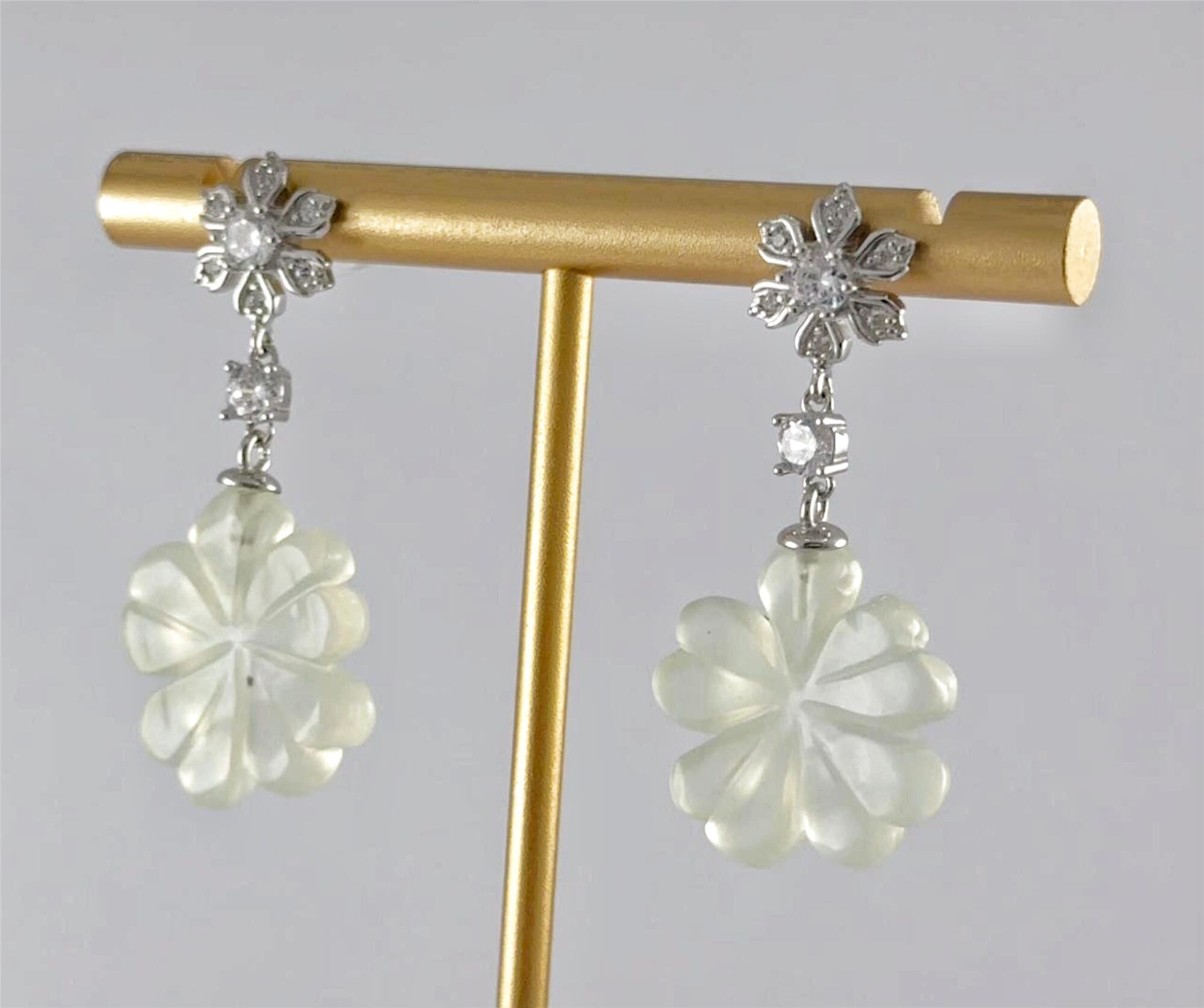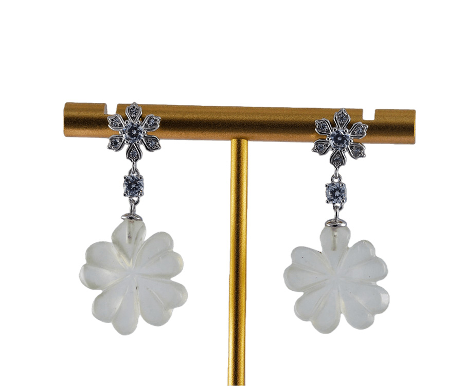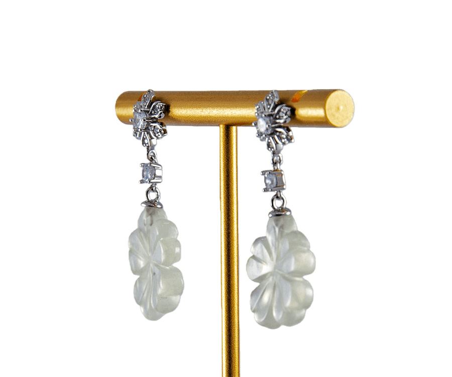 耳钉顶部是一朵手工攥刻的925银丝花。每一片花瓣都以纤细的925银丝精心弯折而成,花瓣密镶小水钻锆石;花心脏位置镶嵌一颗更大的闪耀水钻锆石。一颗镶嵌的单独水钻锆石连接下面,下面是一个天然玉石手工雕刻的四叶草盈盈垂落。玉质温润,造型圆融,匠人以简练刀法保留玉石天然的肌理与光泽。它不争不抢,只静静悬于璀璨花光的尽头,如一句温柔的收尾。