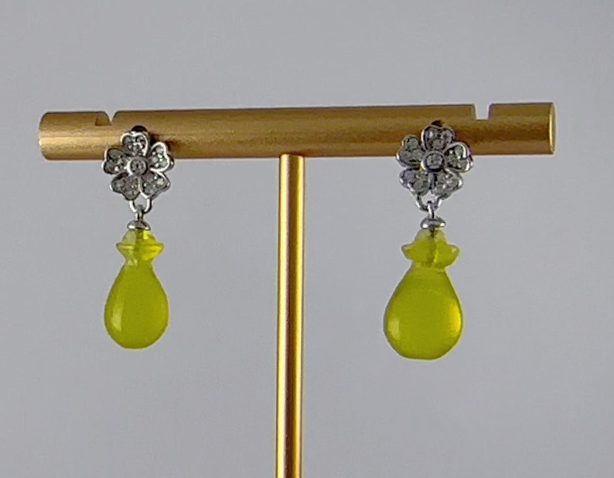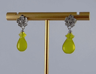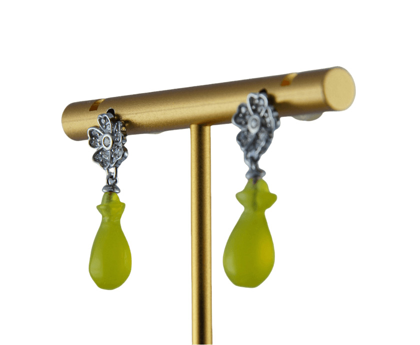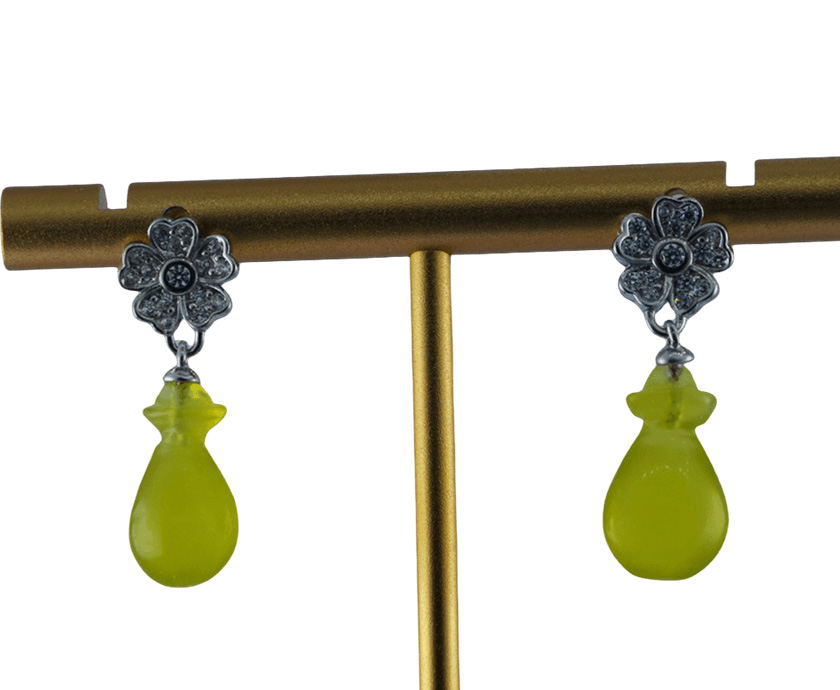 耳钉顶部是一朵手工攥刻的925银丝花。每一片花瓣都以纤细的925银丝精心弯折而成,花瓣中心密镶嵌璀璨小水钻锆石;下面是一个天然玉石手工雕刻的平安瓶盈盈垂落。玉质温润,造型圆融,匠人以简练刀法保留玉石天然的肌理与光泽。它不争不抢,只静静悬于璀璨花光的尽头,如一句温柔的收尾。