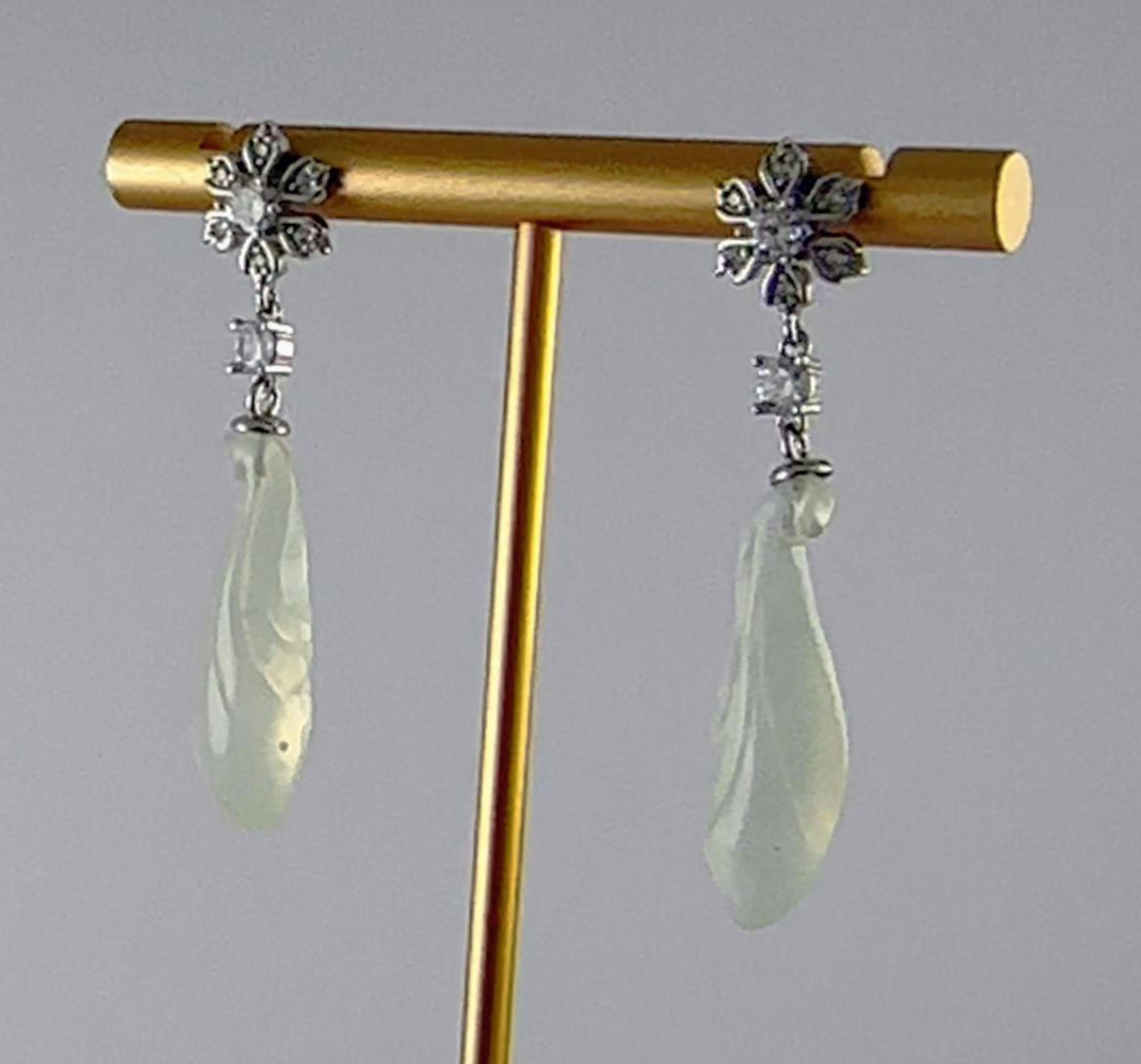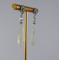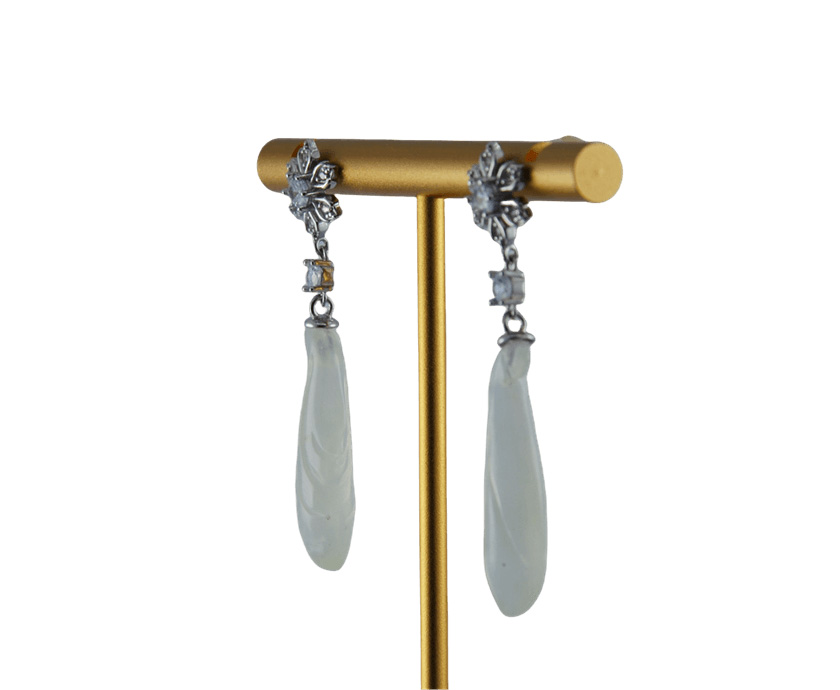 耳钉顶部是一朵手工攥刻的925银丝花。每一片花瓣都以纤细的925银丝精心弯折而成,花瓣密镶小水钻锆石;花心脏位置镶嵌一颗更大的闪耀水钻锆石。一颗镶嵌的单独水钻锆石连接下面,下面是一个天然玉石手工雕刻的玉兰花盈盈垂落。玉质温润,造型圆融,匠人以简练刀法保留玉石天然的肌理与光泽。它不争不抢,只静静悬于璀璨花光的尽头,如一句温柔的收尾。