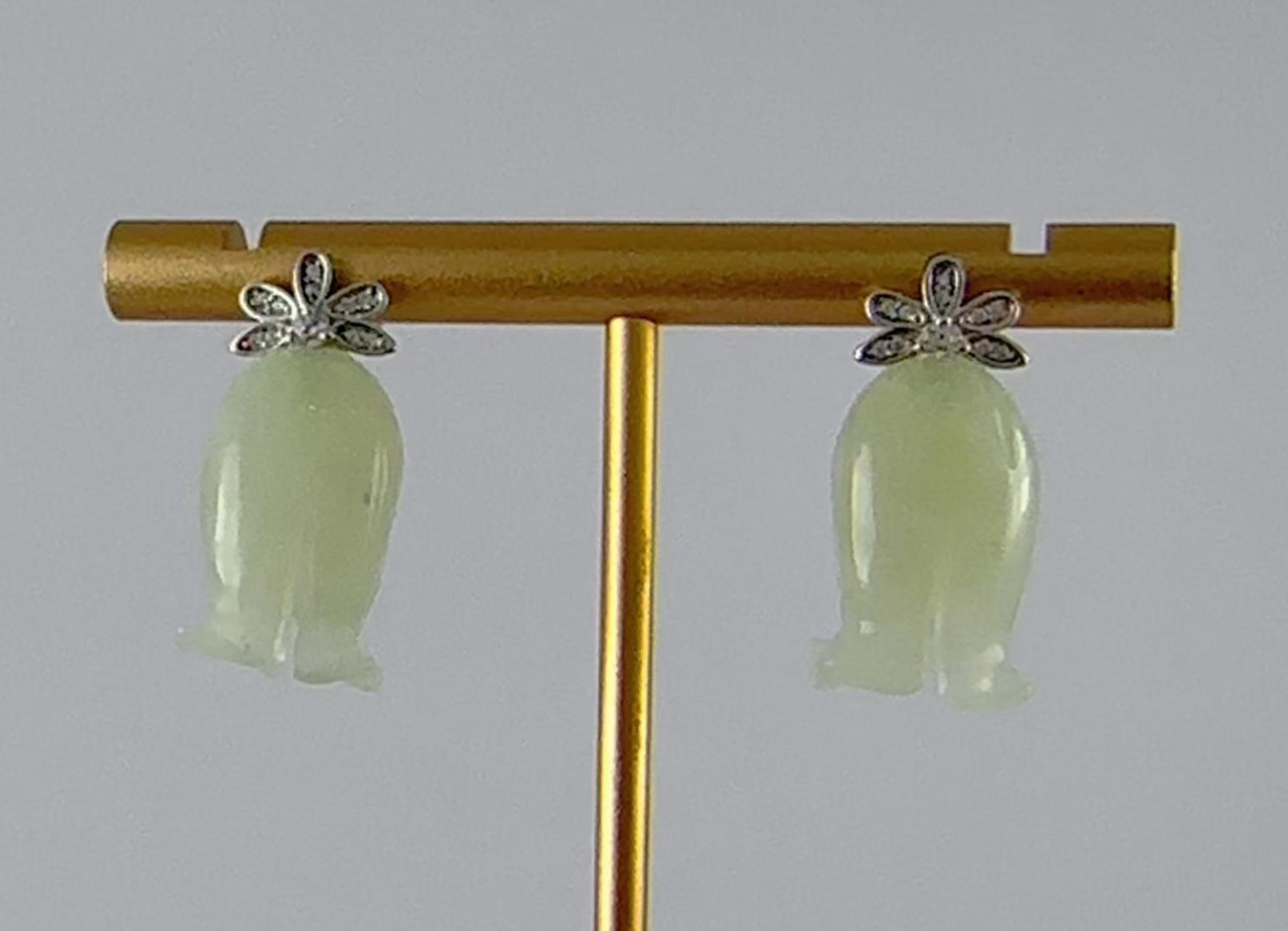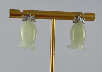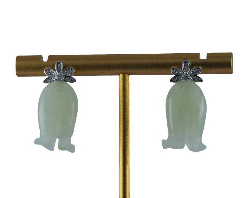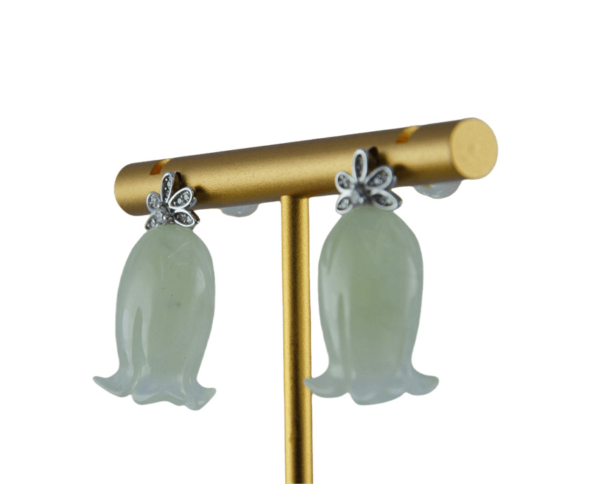 耳钉顶部是一朵手工攥刻的925银丝花。每一片花瓣都以纤细的925银丝精心弯折而成,花瓣中心密镶碎的小水钻锆石;下面是一个天然玉石手工雕刻的铃兰花盈盈垂落。玉质温润,造型圆融,匠人以简练刀法保留玉石天然的肌理与光泽。它不争不抢,只静静悬于璀璨花光的尽头,如一句温柔的收尾。