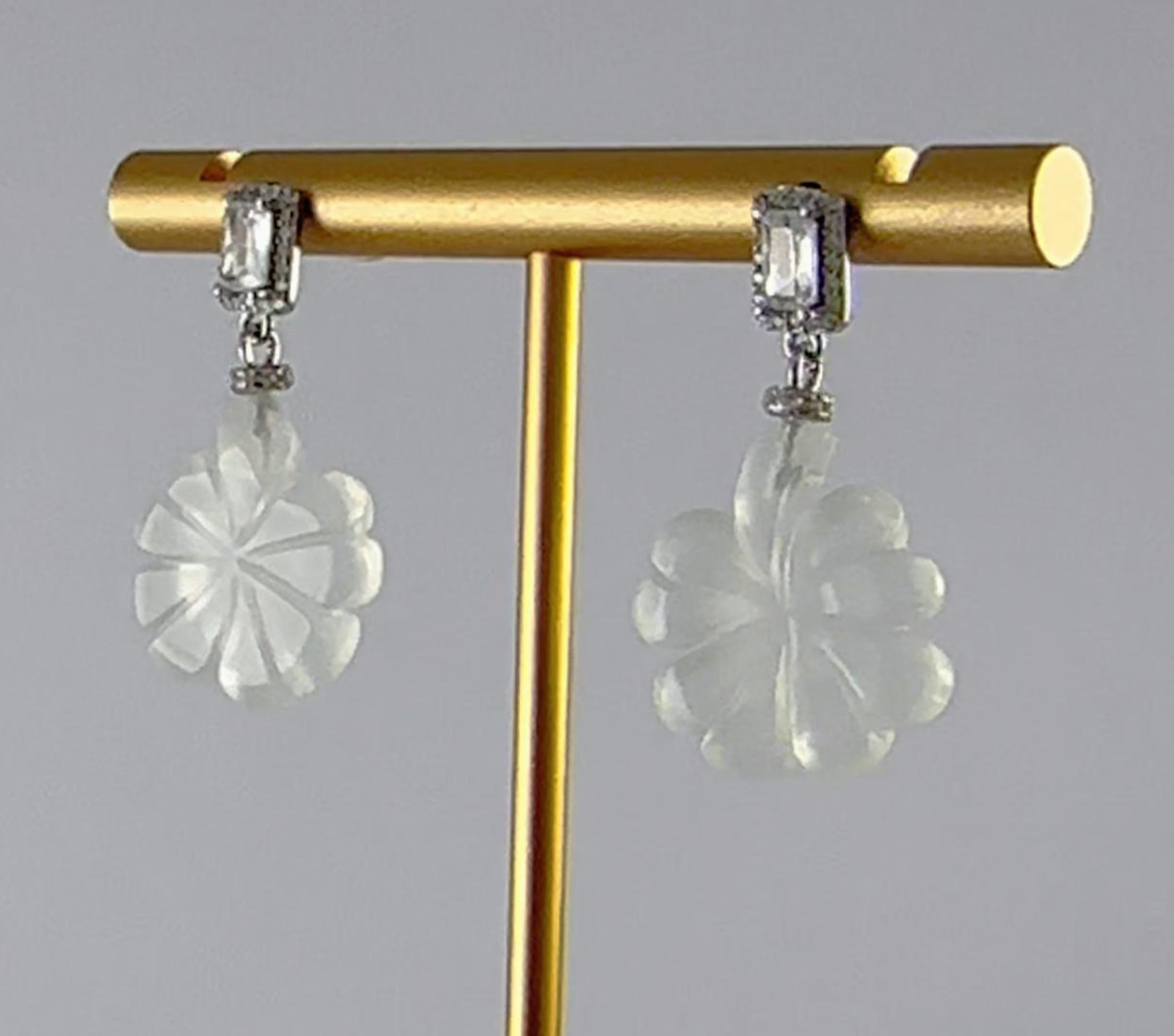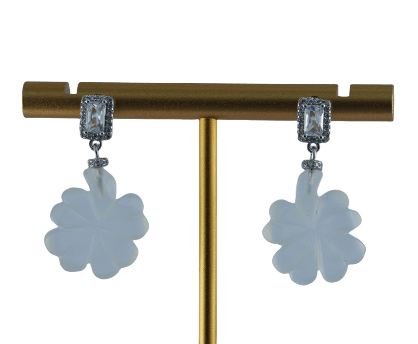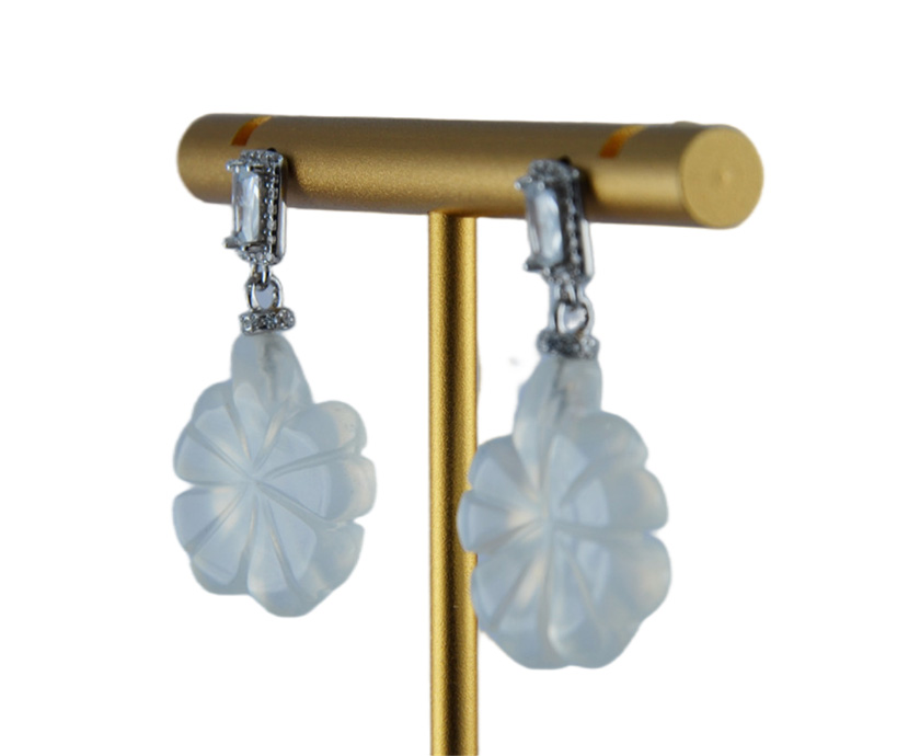 耳钉是一颗璀璨夺目的长方形切割主水钻锆石,在它的四周,以精工密镶一圈细密小水钻锆石。大小水钻交相辉映,主次分明,在方寸之间构筑出既有建筑结构感又不失璀璨华丽的视觉焦点。水钻下是一枚天然玉石手工雕刻而成的四叶草。玉石温润的质感,是任何人工材料都无法复制的生机。匠人依据玉料的原生形态与色泽,磨砺出饱满、线条流畅得仿佛下一秒就要滑落。