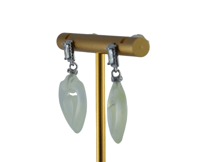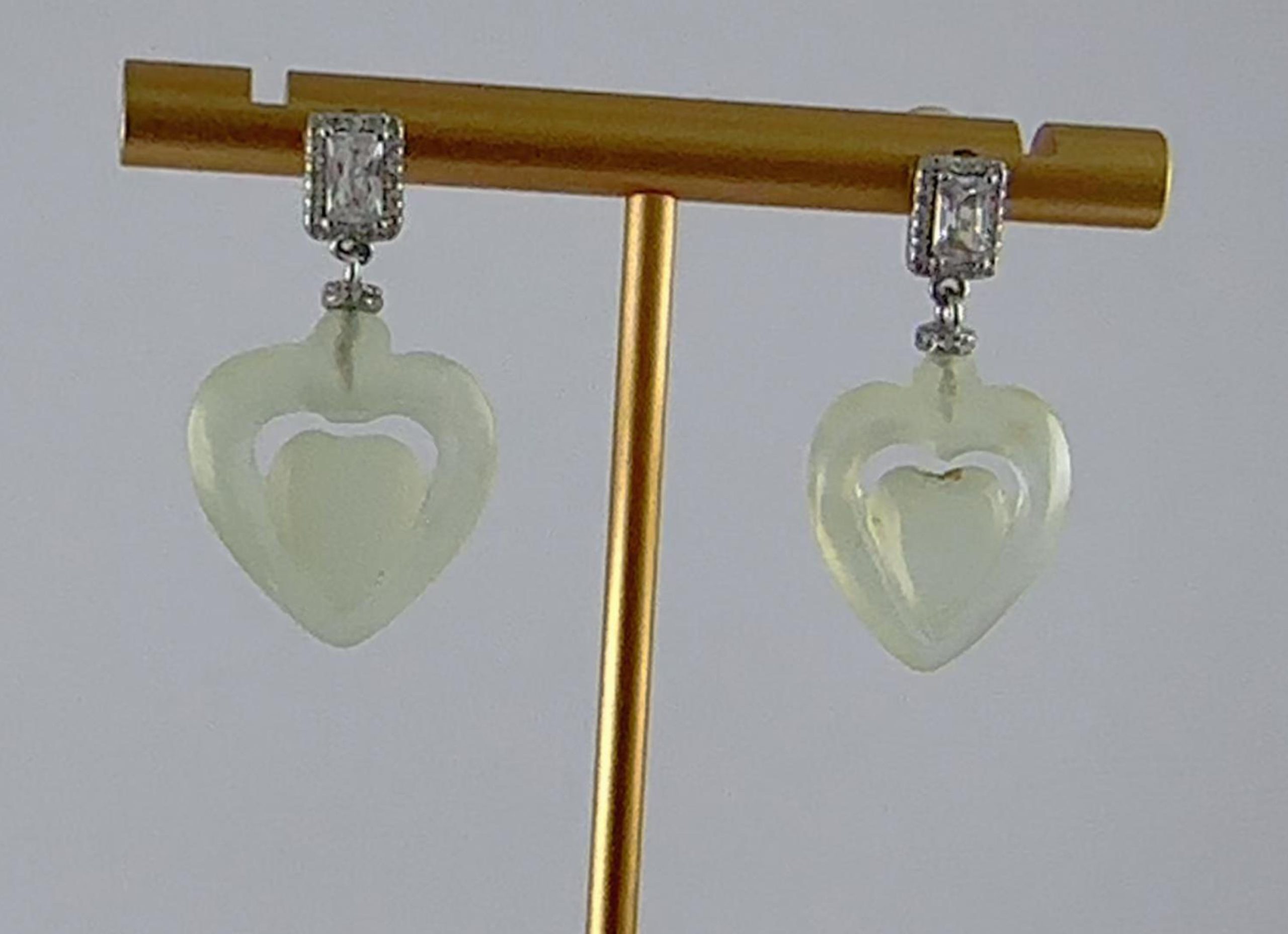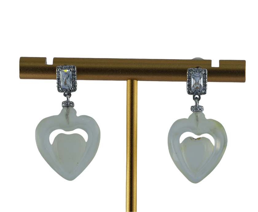 耳钉是一颗璀璨夺目的长方形切割主水钻锆石,在它的四周,以精工密镶一圈细密小水钻锆石。大小水钻交相辉映,主次分明,在方寸之间构筑出既有建筑结构感又不失璀璨华丽的视觉焦点。水钻下是一枚天然玉石手工雕刻而成的桃心。玉石温润的质感,是任何人工材料都无法复制的生机。匠人依据玉料的原生形态与色泽,磨砺出饱满、线条流畅得仿佛下一秒就要滑落。