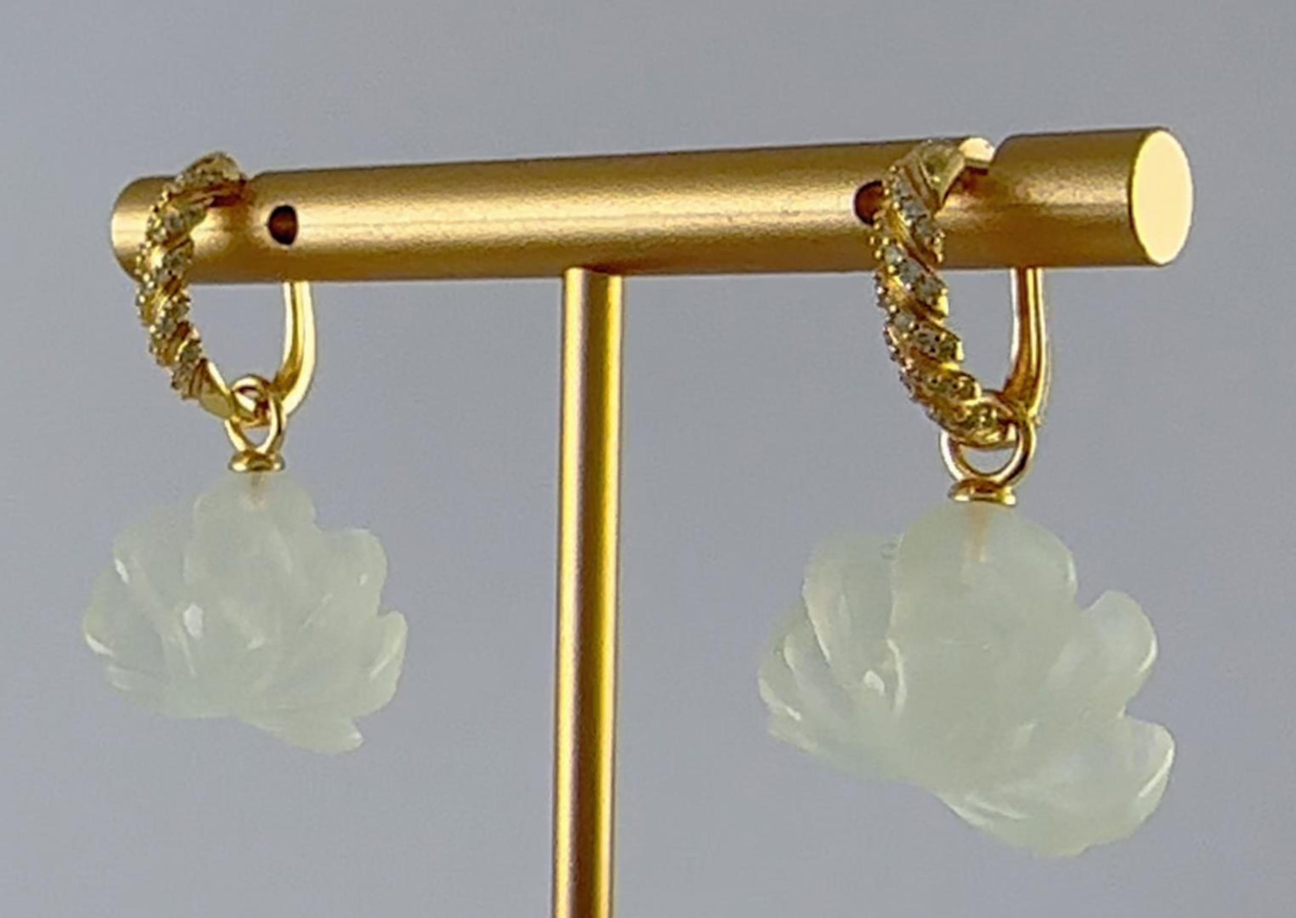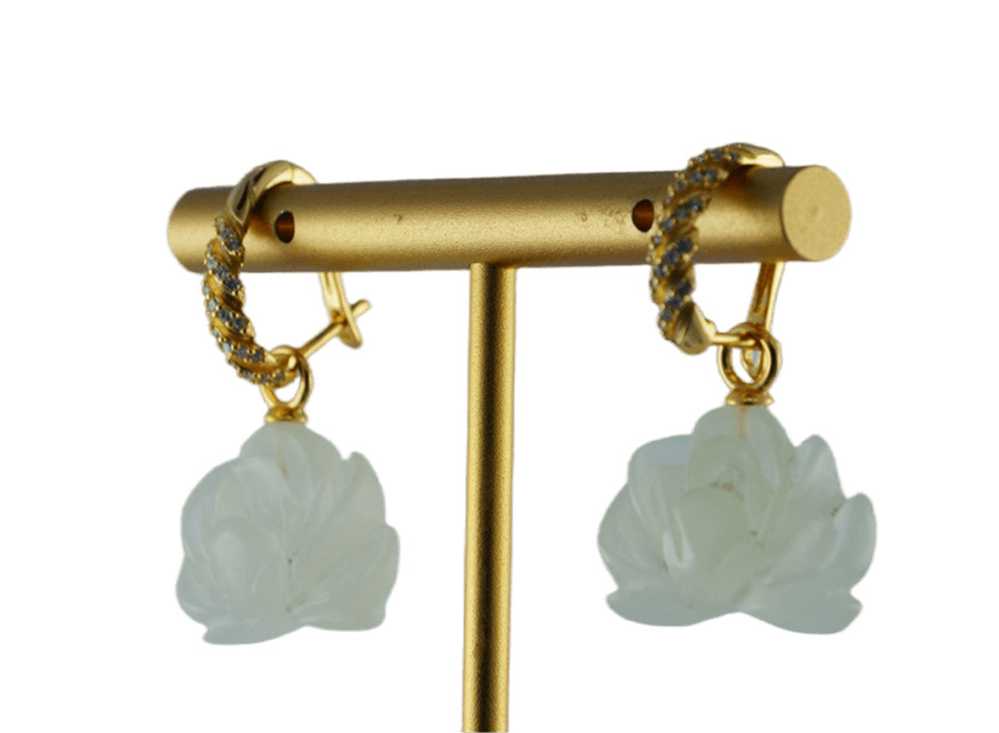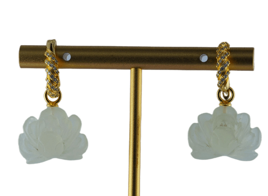 1. 这款耳环的设计灵感源自绳索的自然形态,通过925银丝手工编勾出绳股的造型。银丝经过精细处理,编织出绳索特有的纹理与肌理,每一缕绳股都清晰分明。绳结造型表面,采用满密镶工艺,铺满闪耀的小水钻。绳索下端,通过精巧的连接,垂坠着由天然玉石手工雕刻而成的盛放牡丹。玉石温润如脂,匠人以细腻刀工雕琢出层层绽放的花瓣,牡丹的雍容华贵与饱满姿态被完美呈现。绳索的柔韧与玉花的温润,一刚一柔,诉说着关于相遇与相守的故事。
