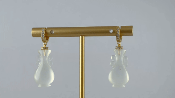 1. 这款耳环采用高品质925银为基底,质地纯净,亲肤不易过敏。匠心密镶数十颗璀璨水钻与高亮锆石,营造出群星环绕的效果。耳环的灵魂系于下面那枚天然玉石雕刻的如意瓶。我们坚持使用天然玉料,并由匠人全手工雕刻成型。每一道弧线都让如意瓶的肌理栩栩如生,是任何人工材料无法比拟的生命力与珍贵感。玉石独有的莹润光泽,在璀璨钻光中平添一份温婉含蓄的东方雅韵。
