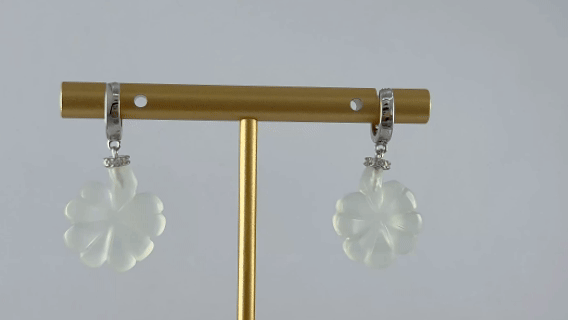 1. 这款耳环采用高品质925银为基底,质地纯净,亲肤不易过敏。匠心密镶数十颗璀璨水钻与高亮锆石,营造出群星环绕的效果。耳环的灵魂系于下面那枚天然玉石雕刻的四叶草。我们坚持使用天然玉料,并由匠人全手工雕刻成型。每一道弧线都让四叶草的肌理栩栩如生,是任何人工材料无法比拟的生命力与珍贵感。玉石独有的莹润光泽,在璀璨钻光中平添一份温婉含蓄的东方雅韵。