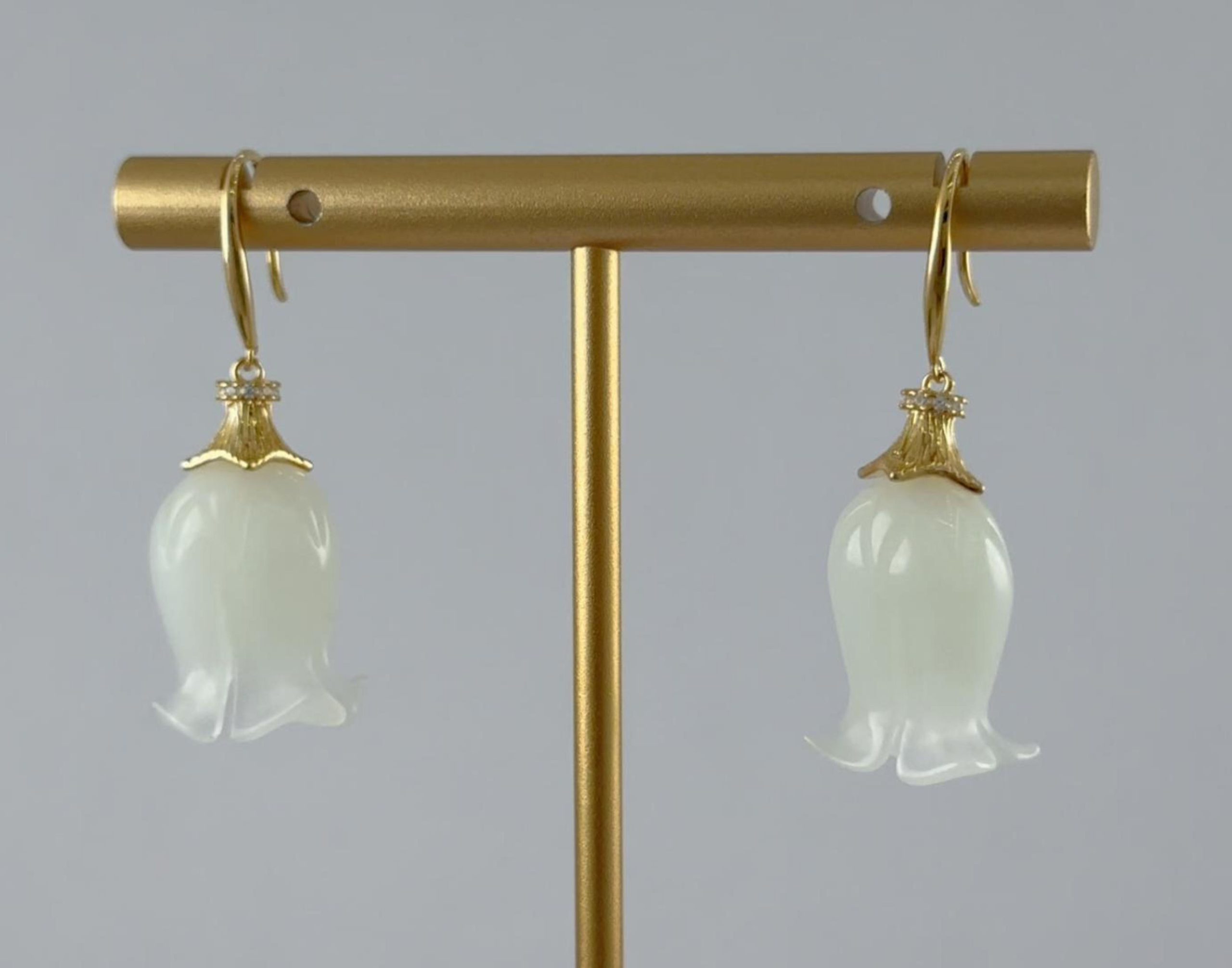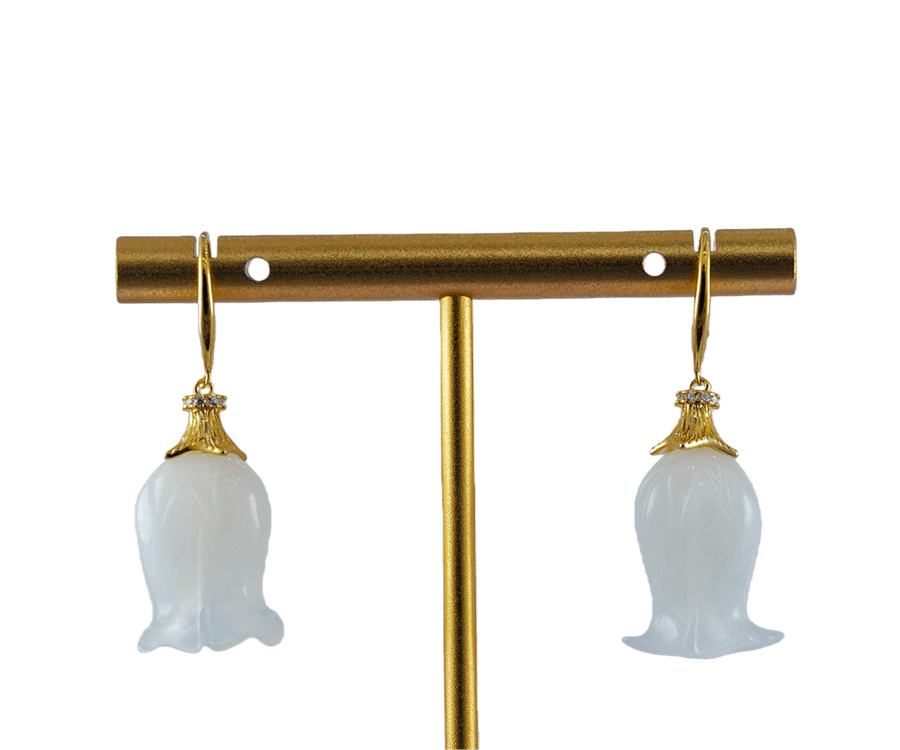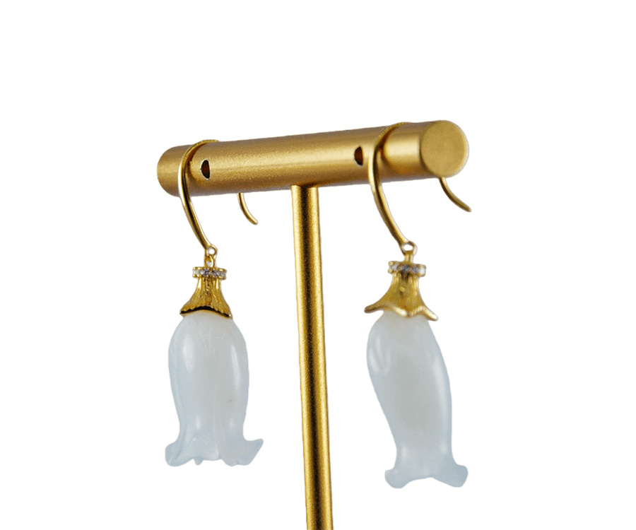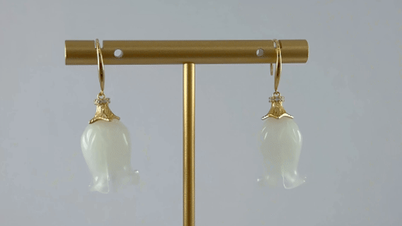 1. 耳钉采用S925银打造,亲肤不易过敏。顶端是一圈镶嵌着小水钻锆石的花环,匠人精心攥刻一朵四瓣精巧的小花瓣的“伞帽”,采用传统纂刻与花丝技法,制作出细腻精致的金属纹理,赋予作品灵动的层次感与呼吸感。下面那颗垂坠而下的天然玉石。匠人全手工将其雕刻成铃兰花的形态,含苞待放,温润如玉,色泽莹透。它随着你的步伐轻轻摇曳,不张扬,却自有一番清冷又温柔的气韵。